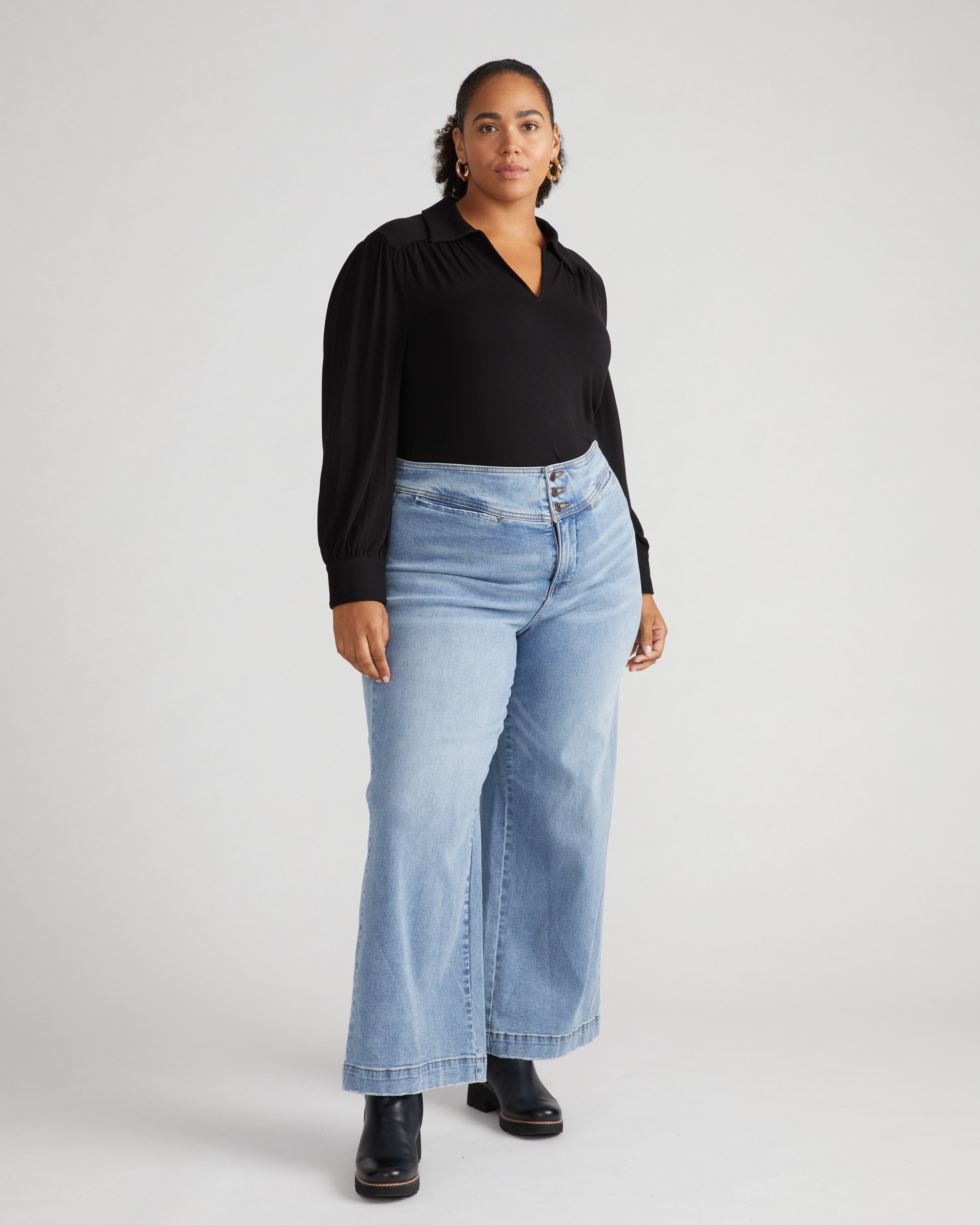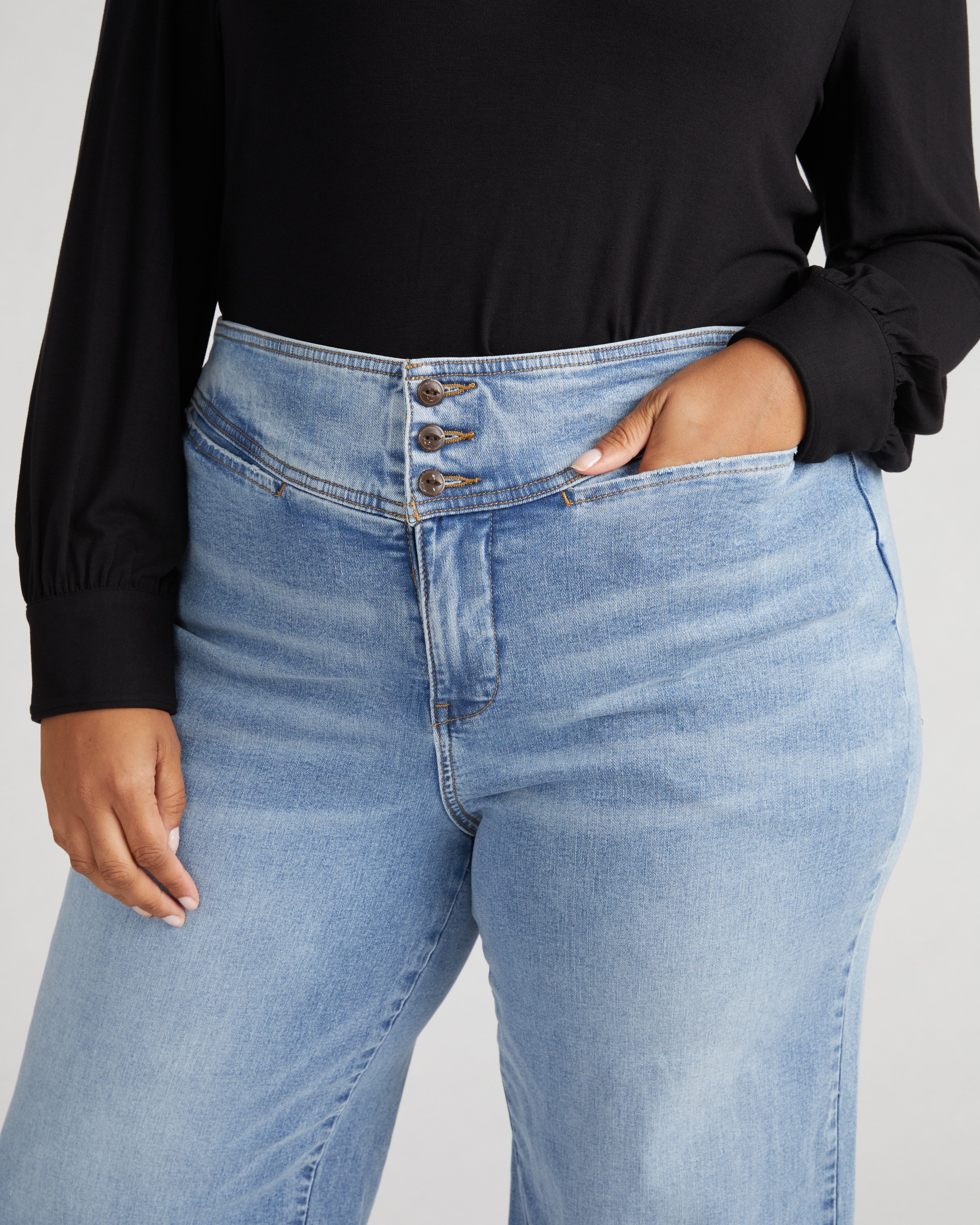 Good Morning, Charlie! These retro sailor-style jeans feature an ultra high rise and a wide leg. You’ve been waiting for these. Everyone’s closet needs that trouser-style denim from the 1970s. The fit is elongating and chic. We’ve put shaping darts at the back, three buttons at the waist, and top-entry pockets that sit flat.