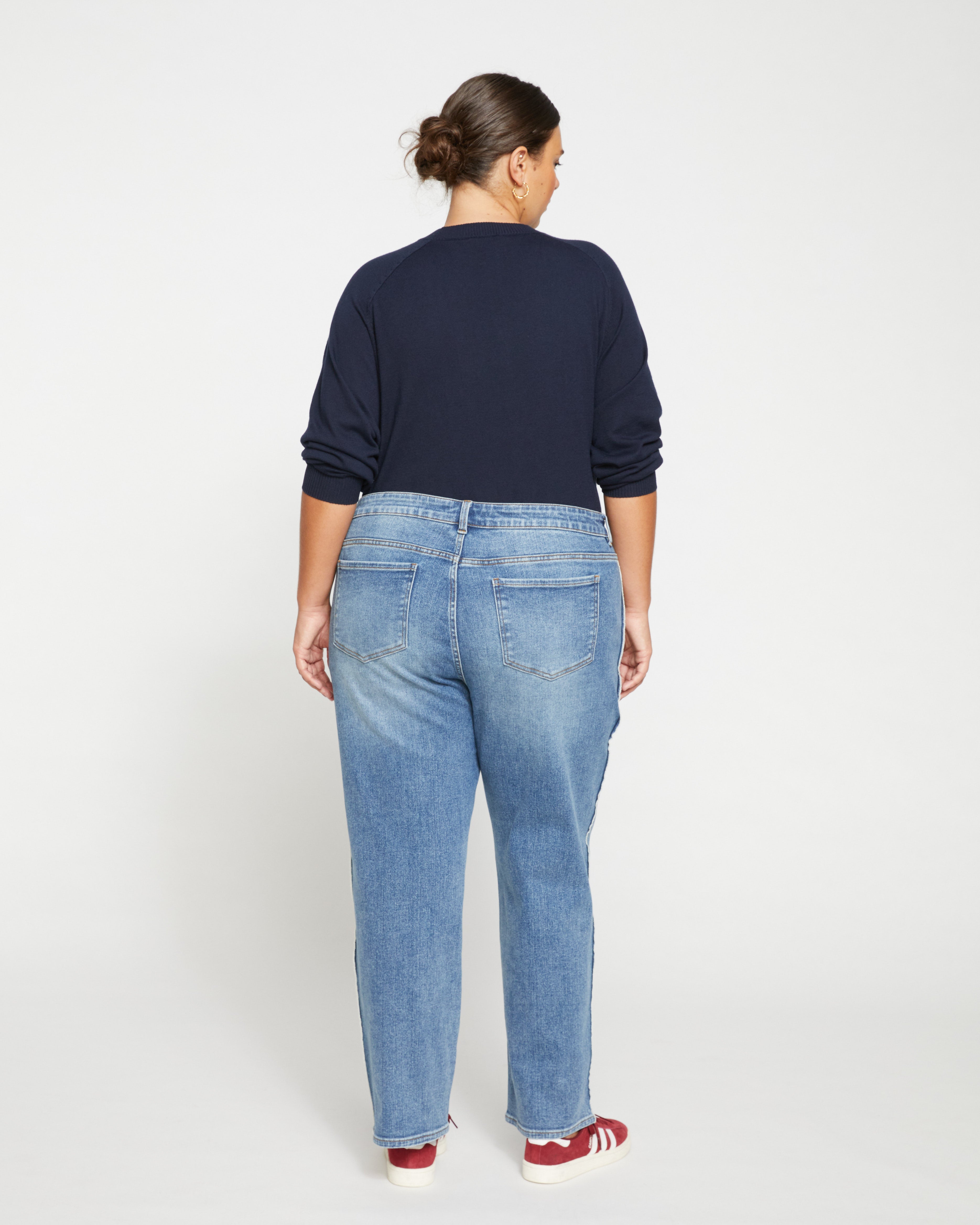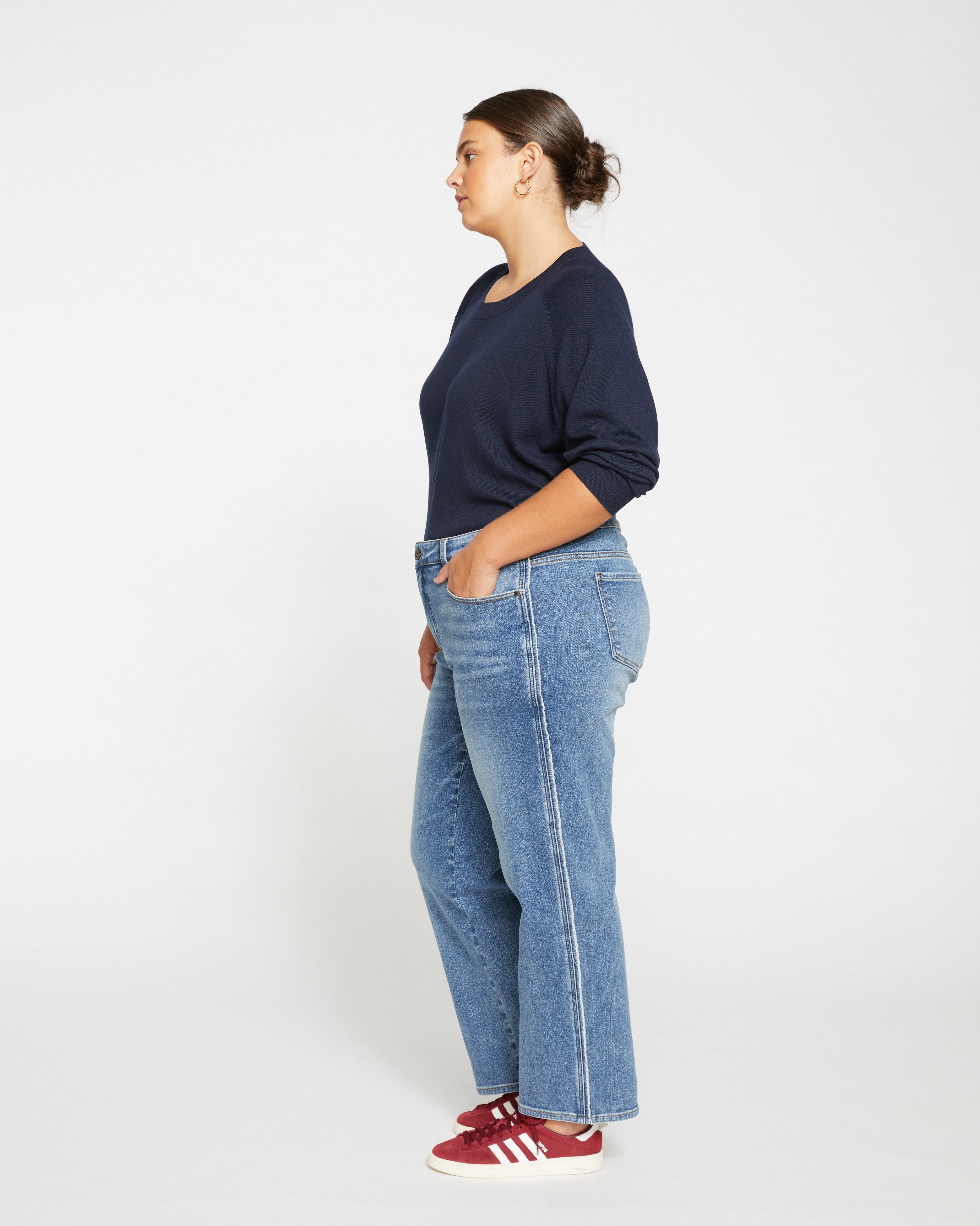 Say hello to your new fun, fashionable jeans. With an easy straight leg that fits like our signature Etta Jeans, this pair features an on-trend mid-rise. We wanted to tap into the rise trend of the moment, but don’t worry—ours still hits higher than most and was engineered for the most comfortable fit. The Elliot also features a contrasting tuxedo side trim down each leg. We suggest wearing these with one of our new blazers to complete the look.