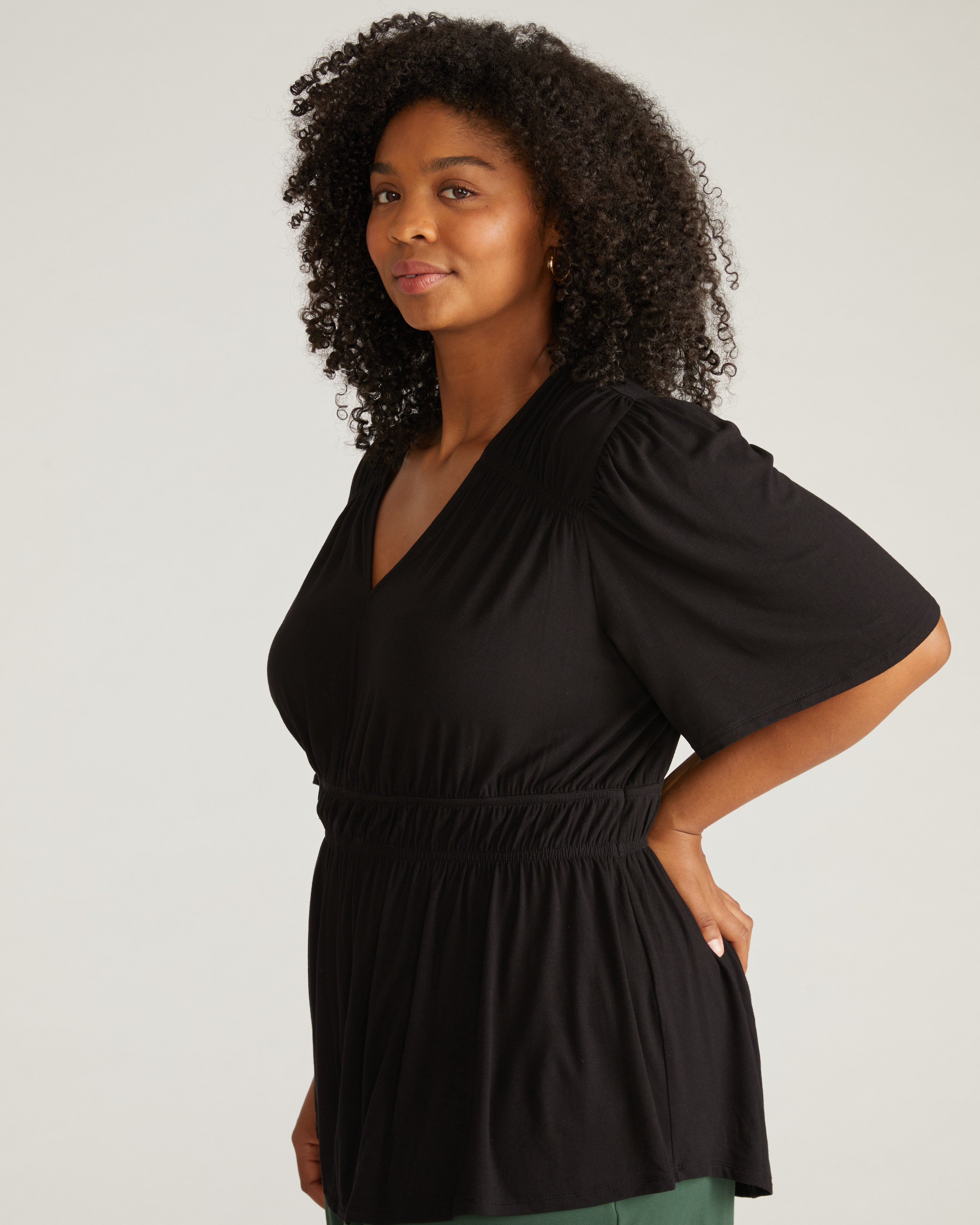 Our 'plus size, straight size, your size' approach to design shines in the Flora Liquid Jersey Top. Crafted from our stretch jersey fabric that looks (and feels) great on everyone, this V-neck style features soft gathering that cascades gently from the shoulders to the waist, ending in a loose peplum-style hem and a generous sleeve. Lightweight and breathable, it's perfect worn untucked over pants or jeans.