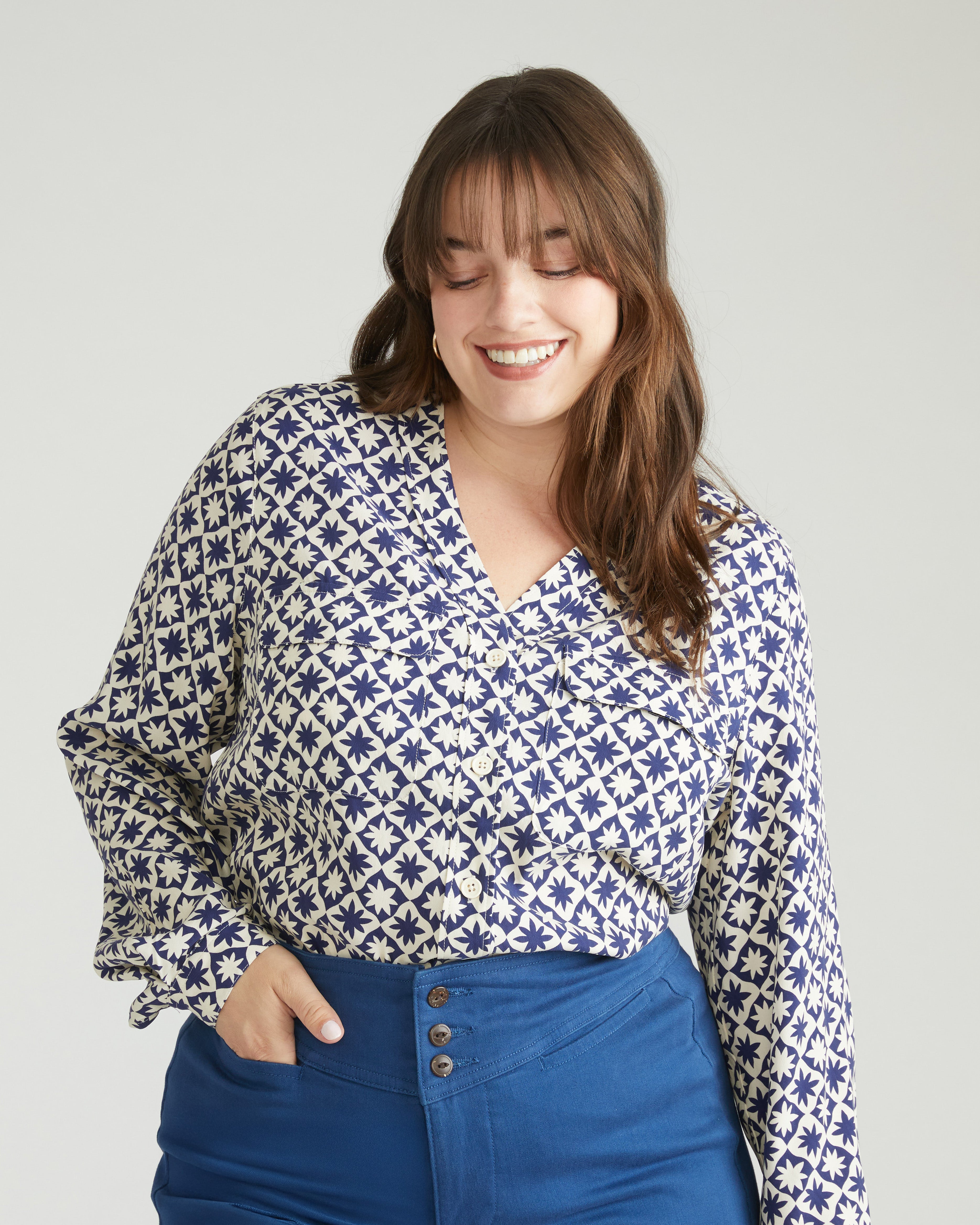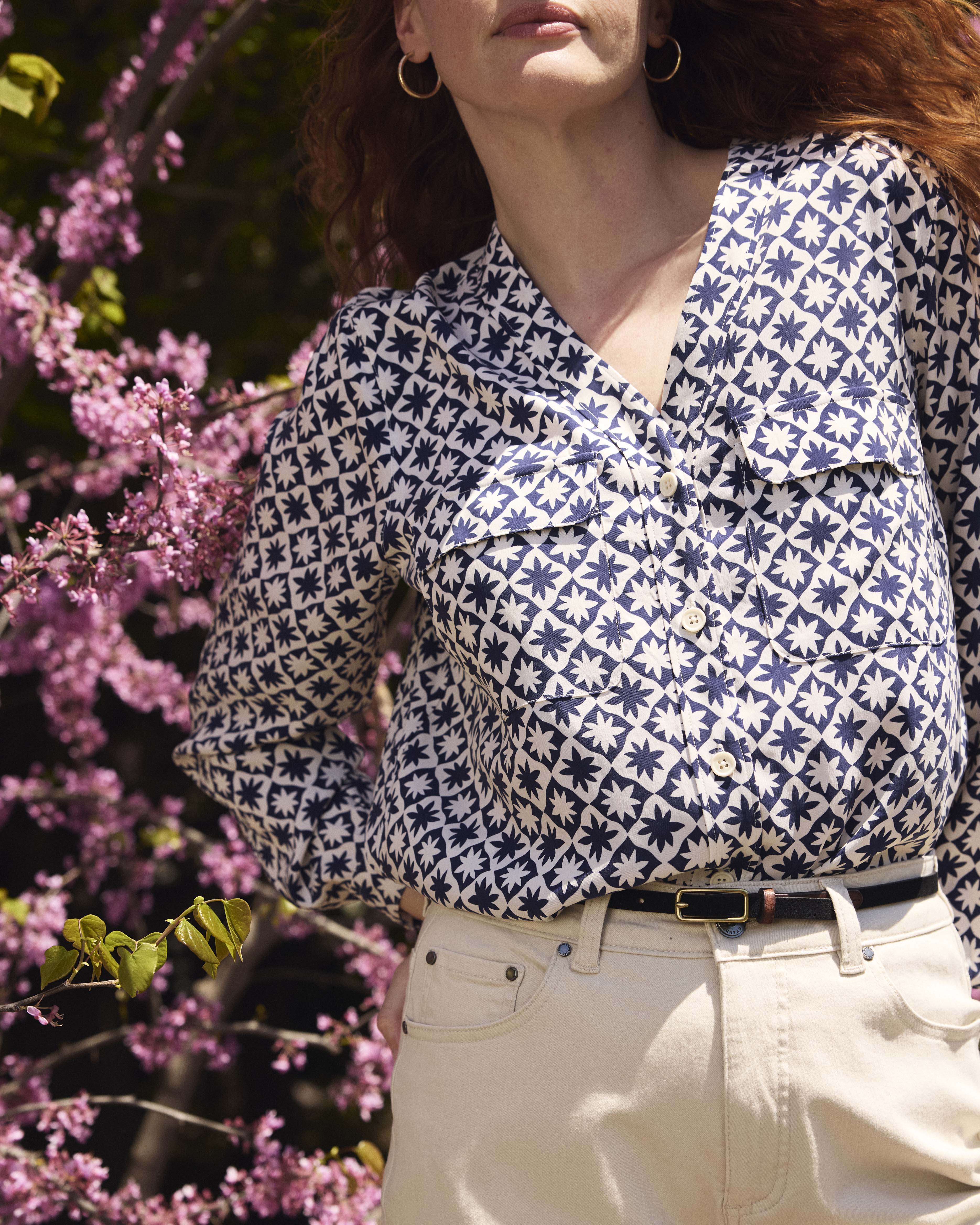Cooling Stretch Cupro Button-Down Blouse - Navy Hacienda Print
