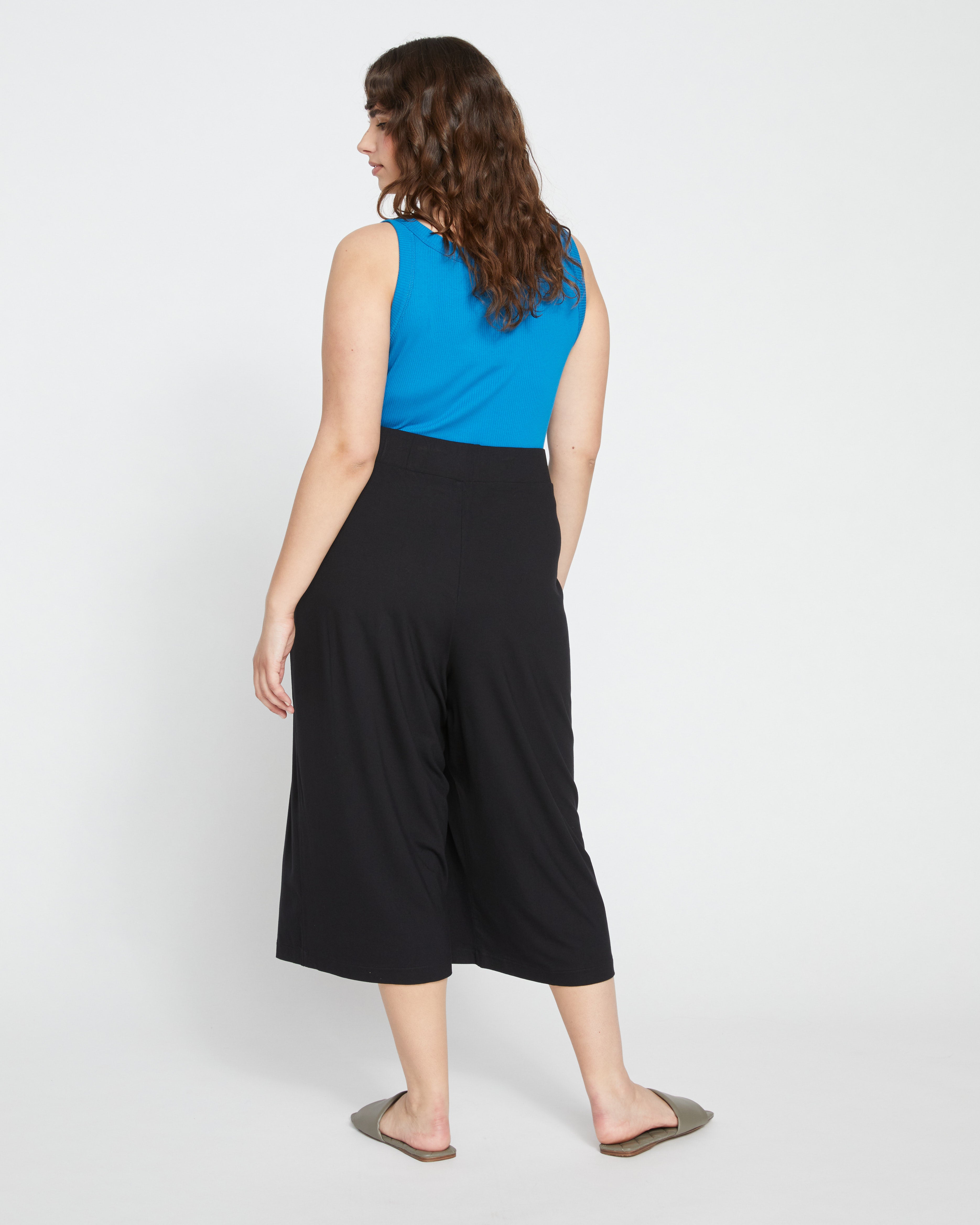 The perfect spring culottes. These are the easy, breezy, cropped pants you need. We searched for this heavyweight jersey fabric forever and are so excited for you to feel it. These petite-friendly pants feature an encased-elastic waistband that is soft, easy, and won't twist or roll throughout the day. Front pleats highlight the flowy fabric and add a soft drape through the legs.