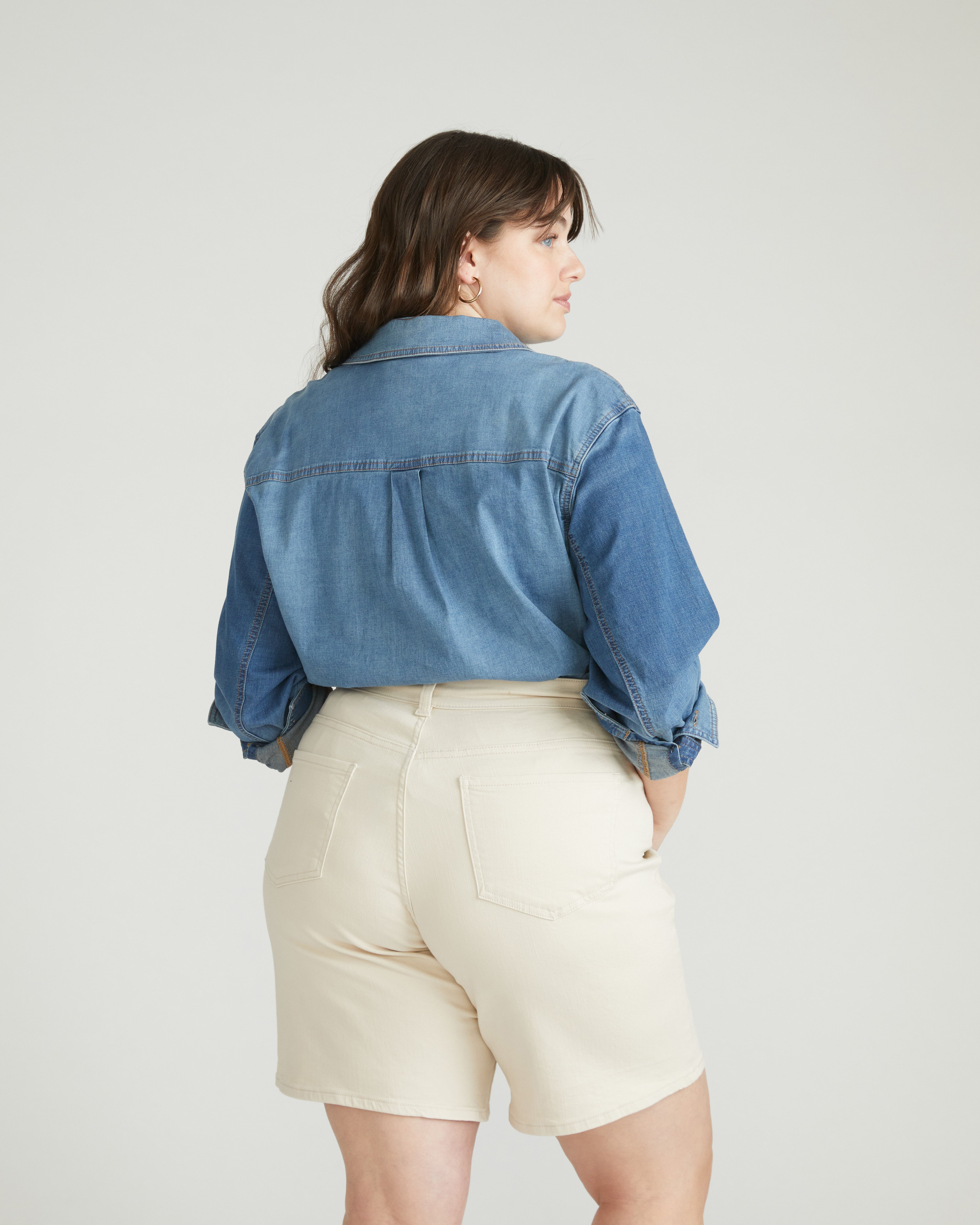 This pair of shorts is the sister of our Lou jean. You’ll love the easy fit and wide leg. They're made from a structured (but still stretchy) denim that holds its shape. You’ll see this silhouette everywhere come summer, so we suggest snatching a pair early and practicing your styling.
