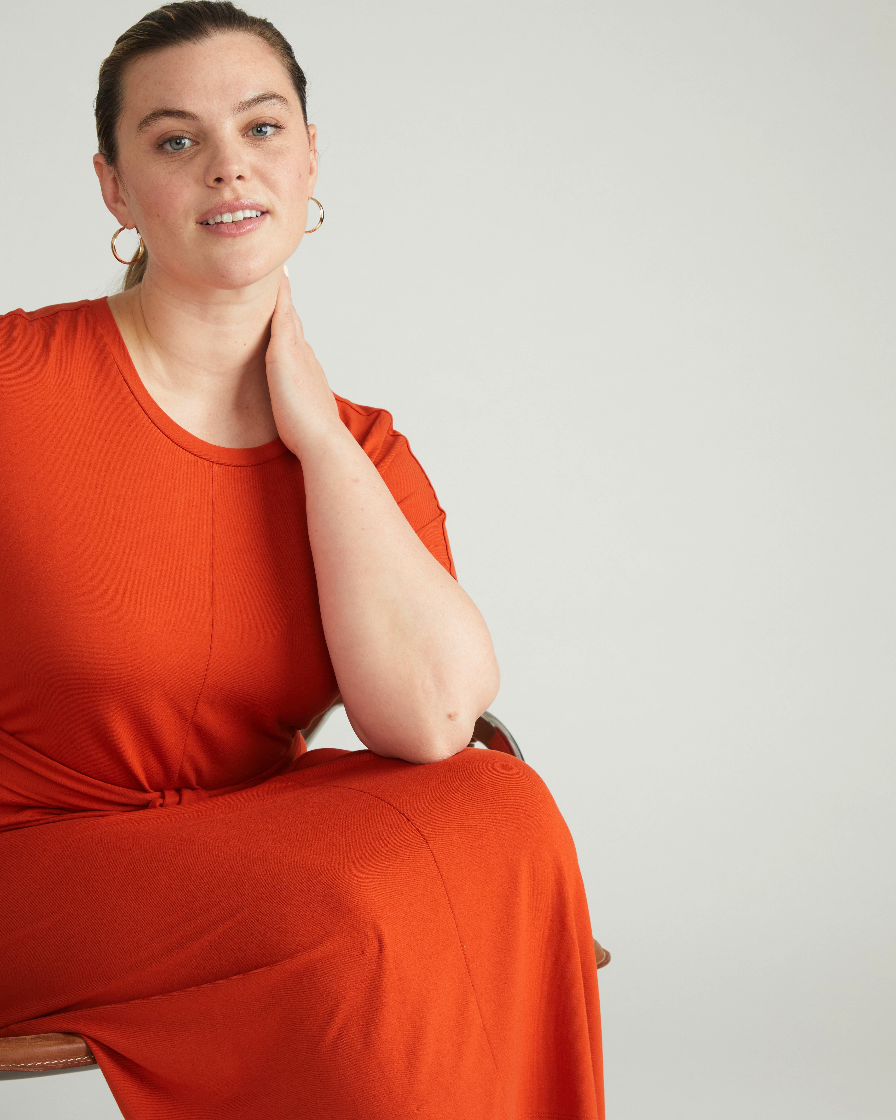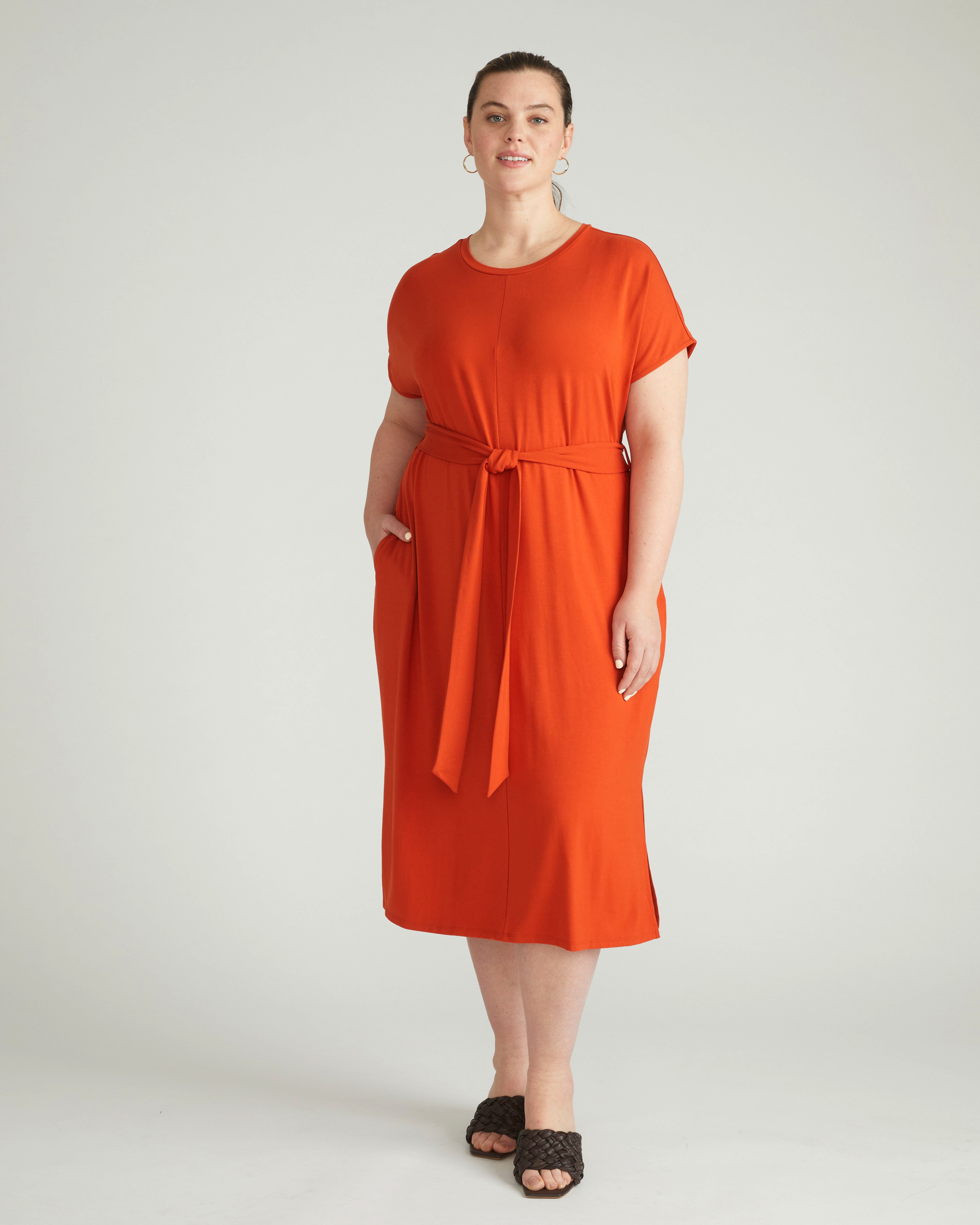 Sophisticated meets casual. This classic dress is made from our softly structured divine jersey that has a luxe look and feel. Elegant and classic with the comfort of your favorite pajamas. Key details include the crew neck, short sleeves, a keyhole back, side slits at the hem, and a self belt