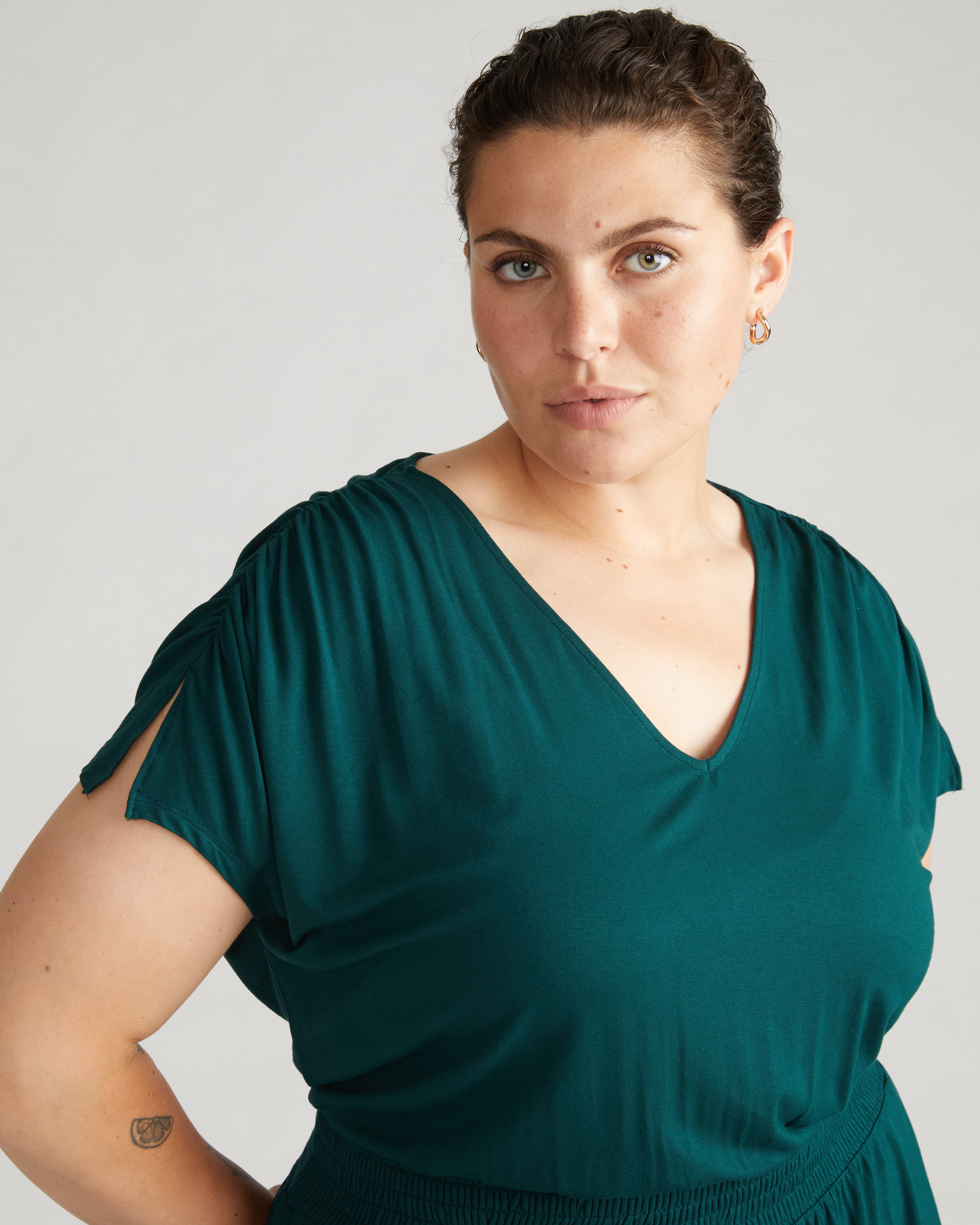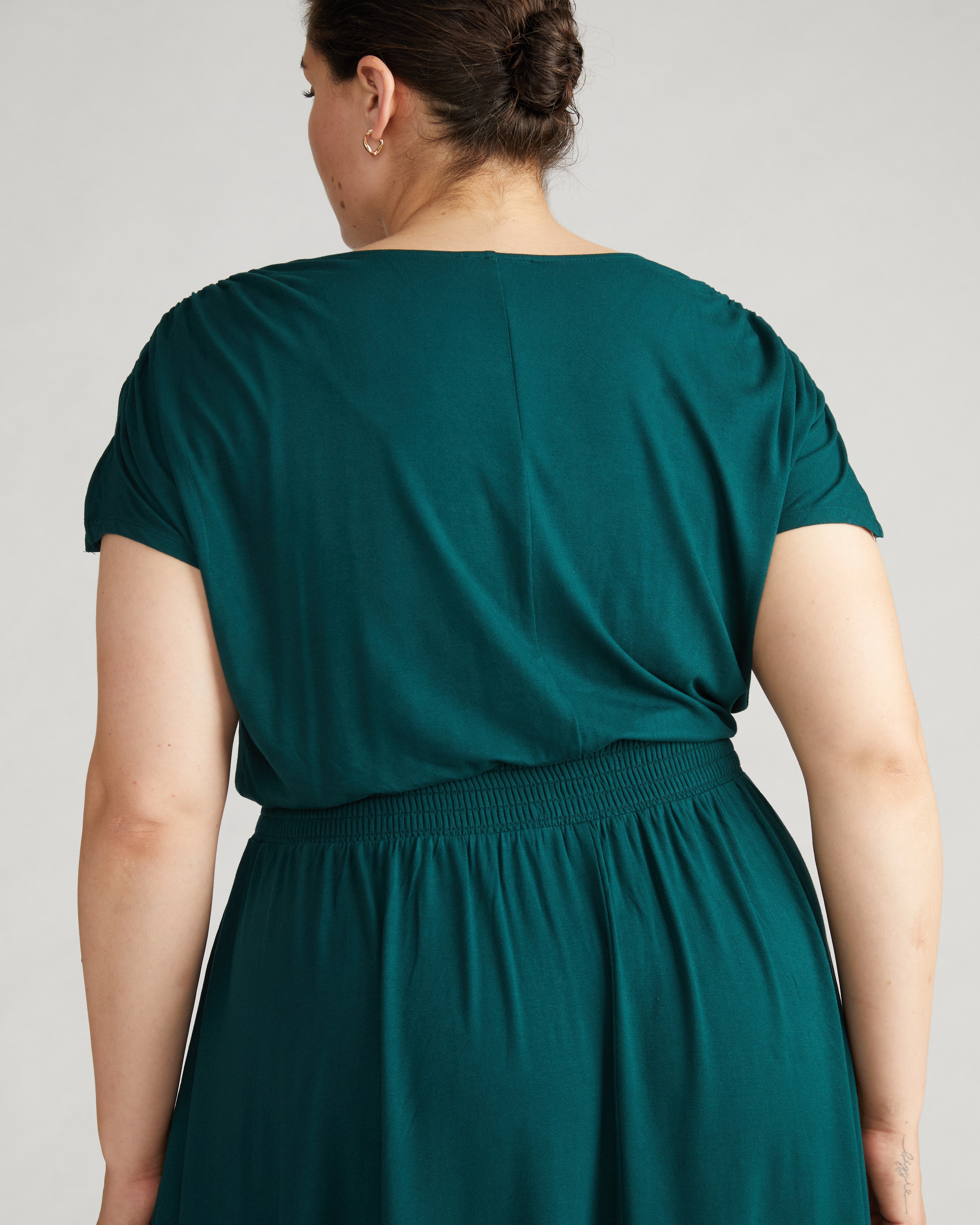 Meet the dress designed for date night. It��s a throw-on-and-go style in our soft and drapey liquid jersey. With a V-neckline, gathered shoulders, and a shirred waistband it��s simple but just detailed enough to draw onlookers in. Perfect for balmy evenings bouncing between comedy clubs and jazz bars, followed by a walk through the moonlit park.