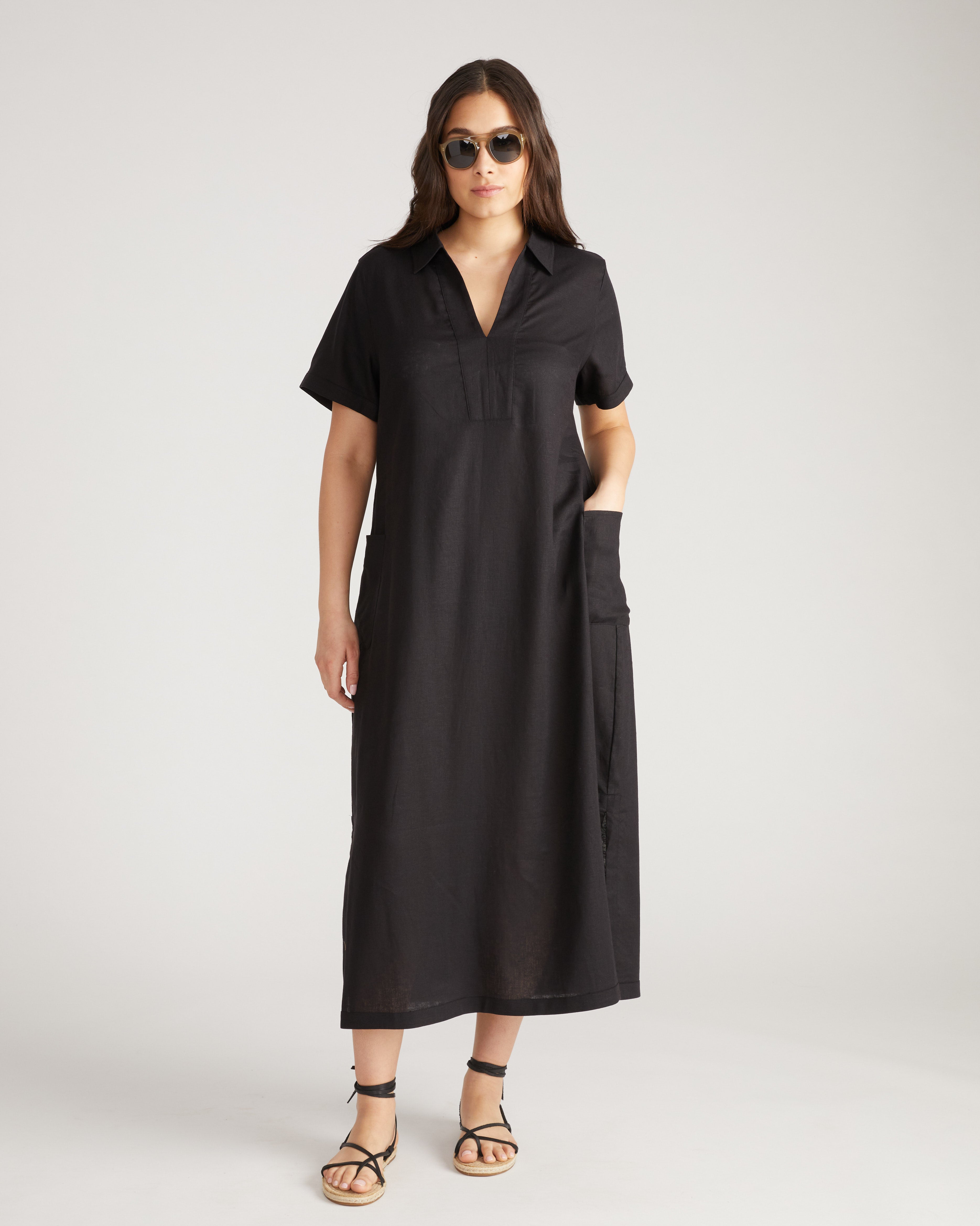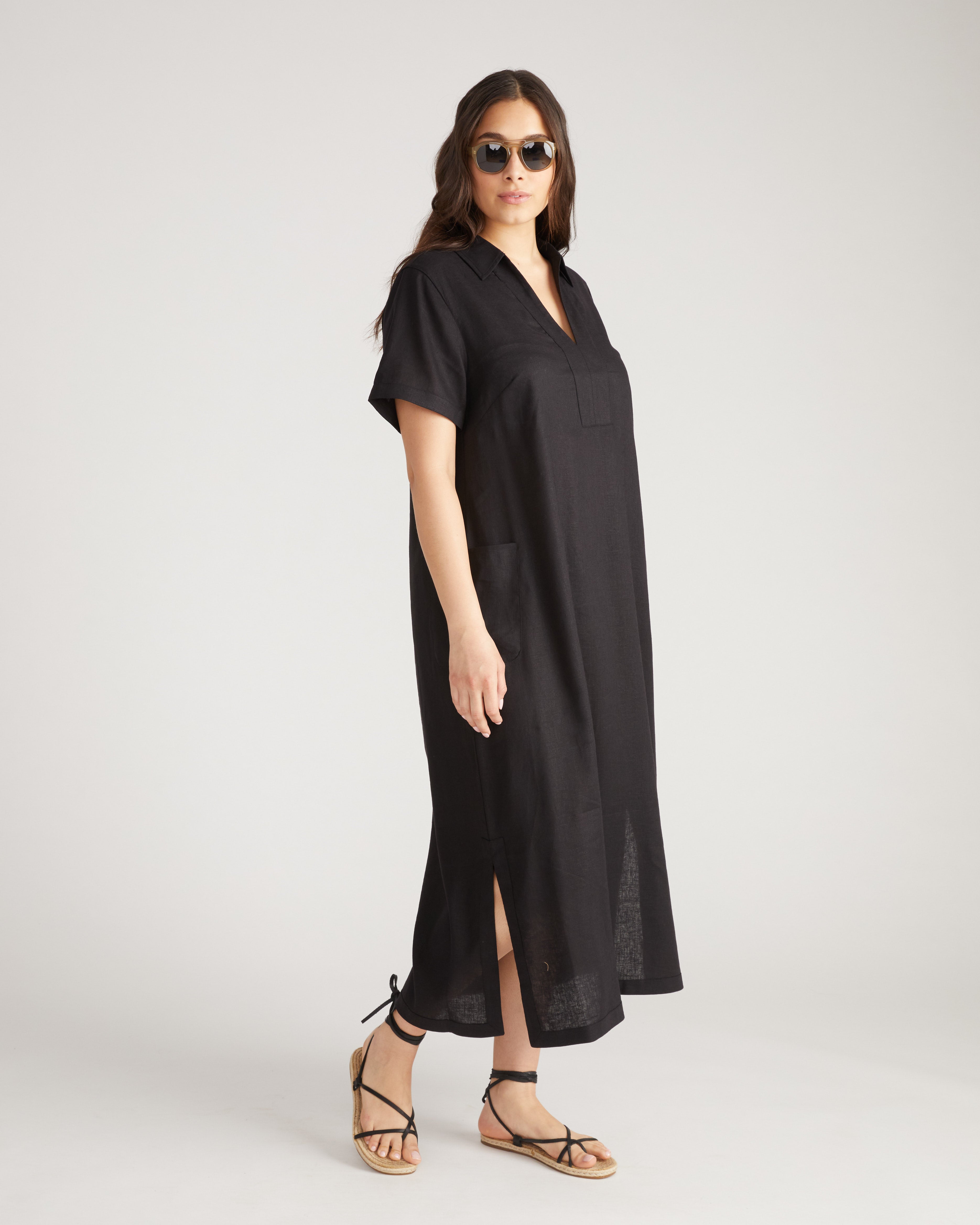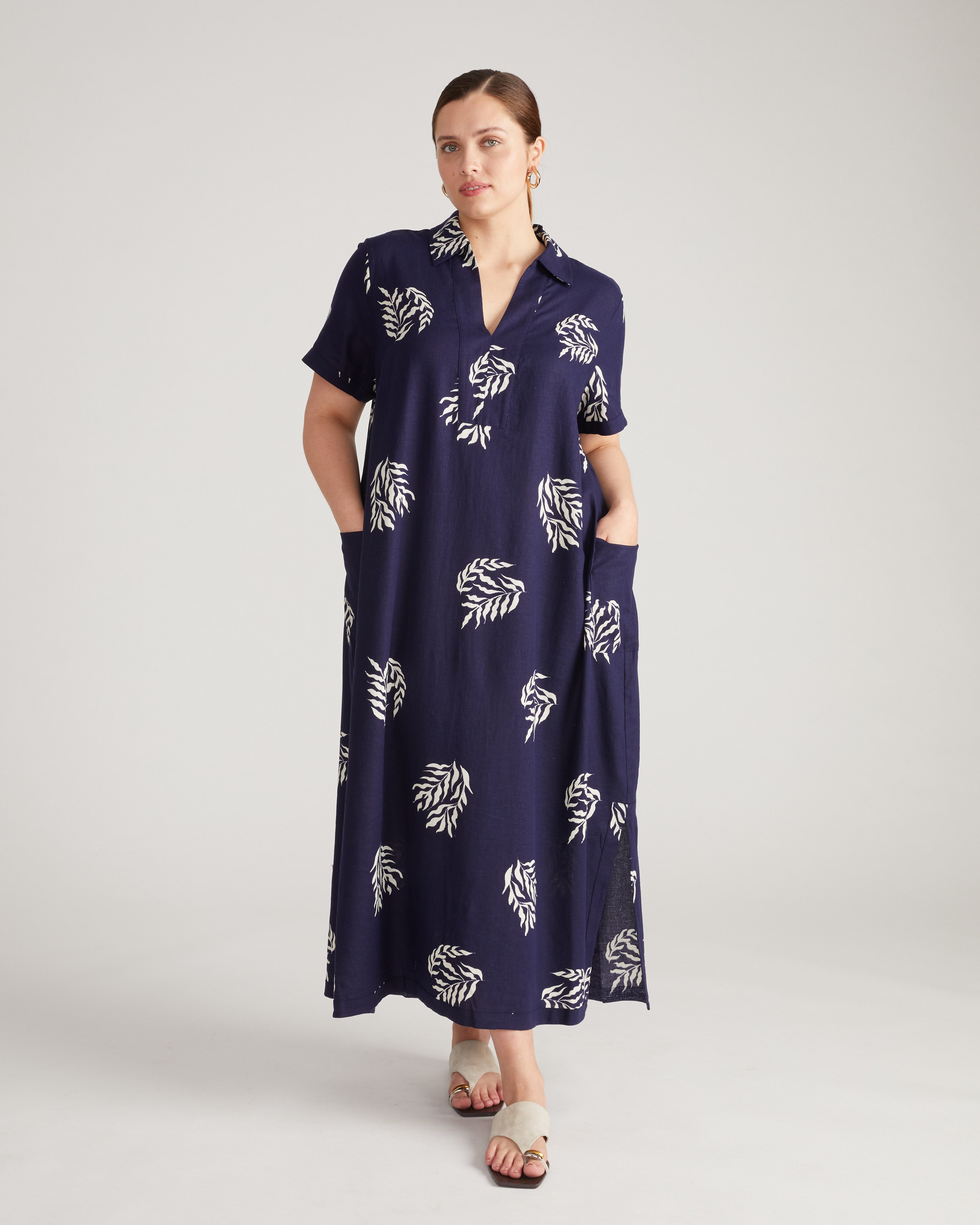 Padma Polo Neck Linen Dress - Beachgrass Print in Navy