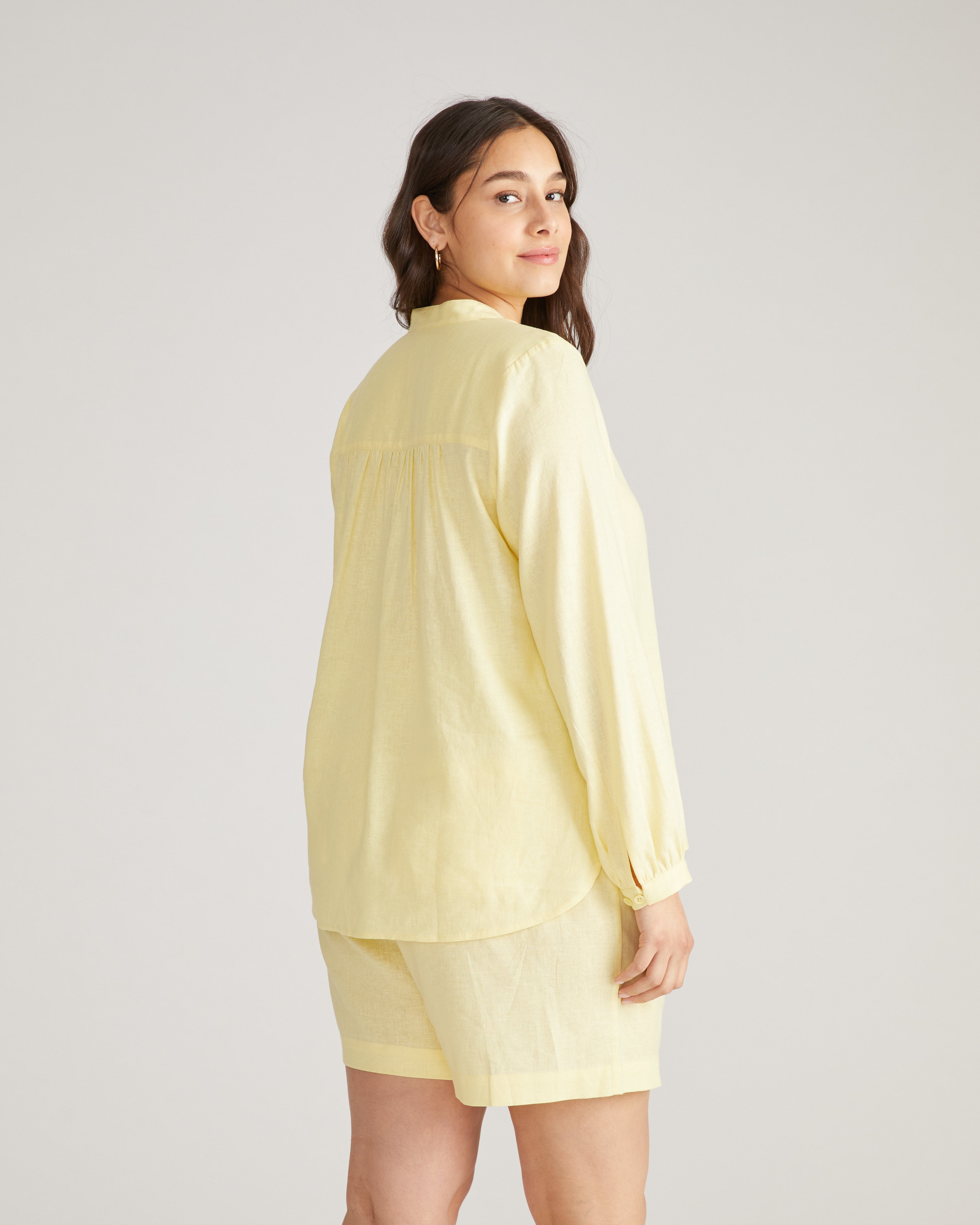 Crafted from our lightweight stretch linen, the Avalon Top adds a touch of romance to understated elegance. A soft bloom of volume in the sleeves and gentle gathering at the shoulders create a relaxed fit, while the cutaway neckline and button detailing make this one of the easiest tops to fall in love with. Pair it with our matching linen shorts or pants.