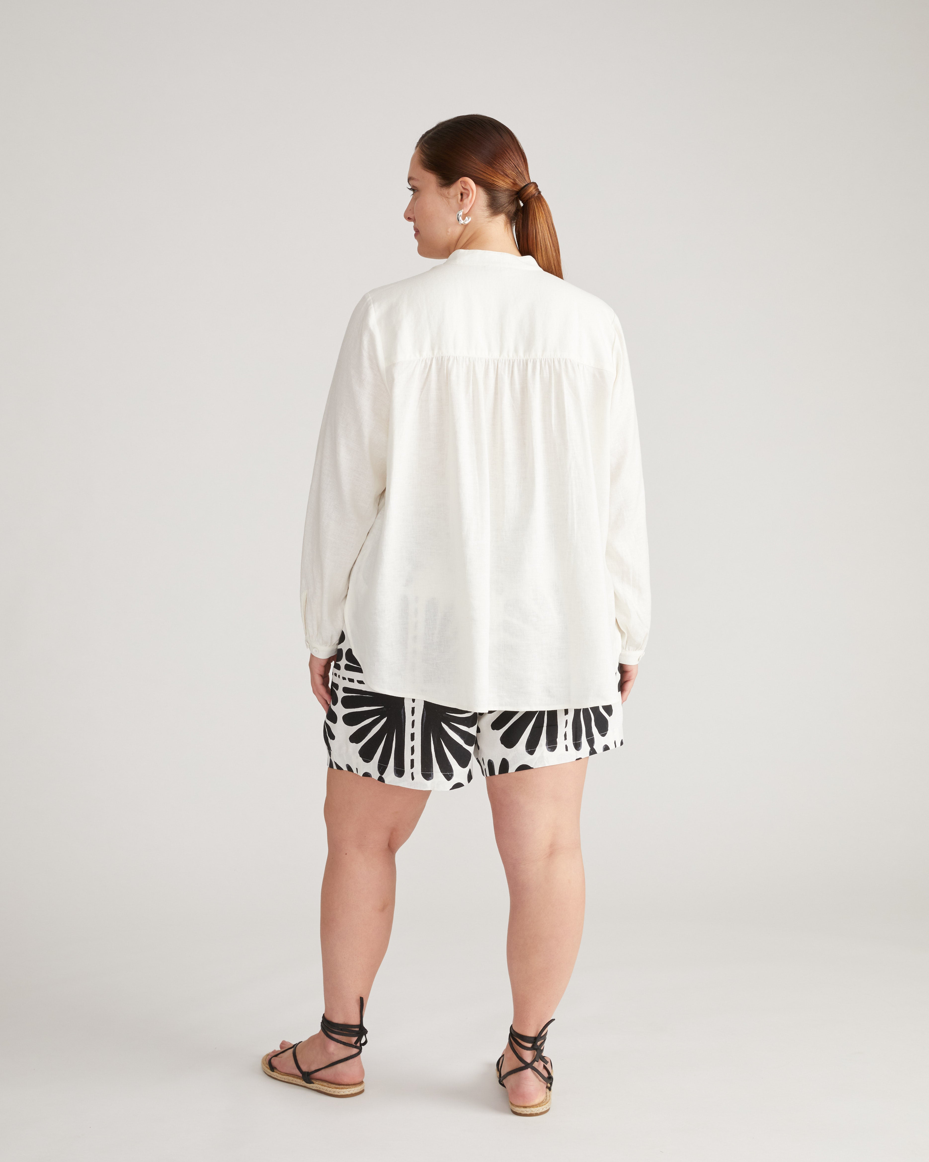 Crafted from our lightweight stretch linen, the Avalon Top adds a touch of romance to understated elegance. A soft bloom of volume in the sleeves and gentle gathering at the shoulders create a relaxed fit, while the cutaway neckline and button detailing make this one of the easiest tops to fall in love with. Pair it with our matching linen shorts or pants.