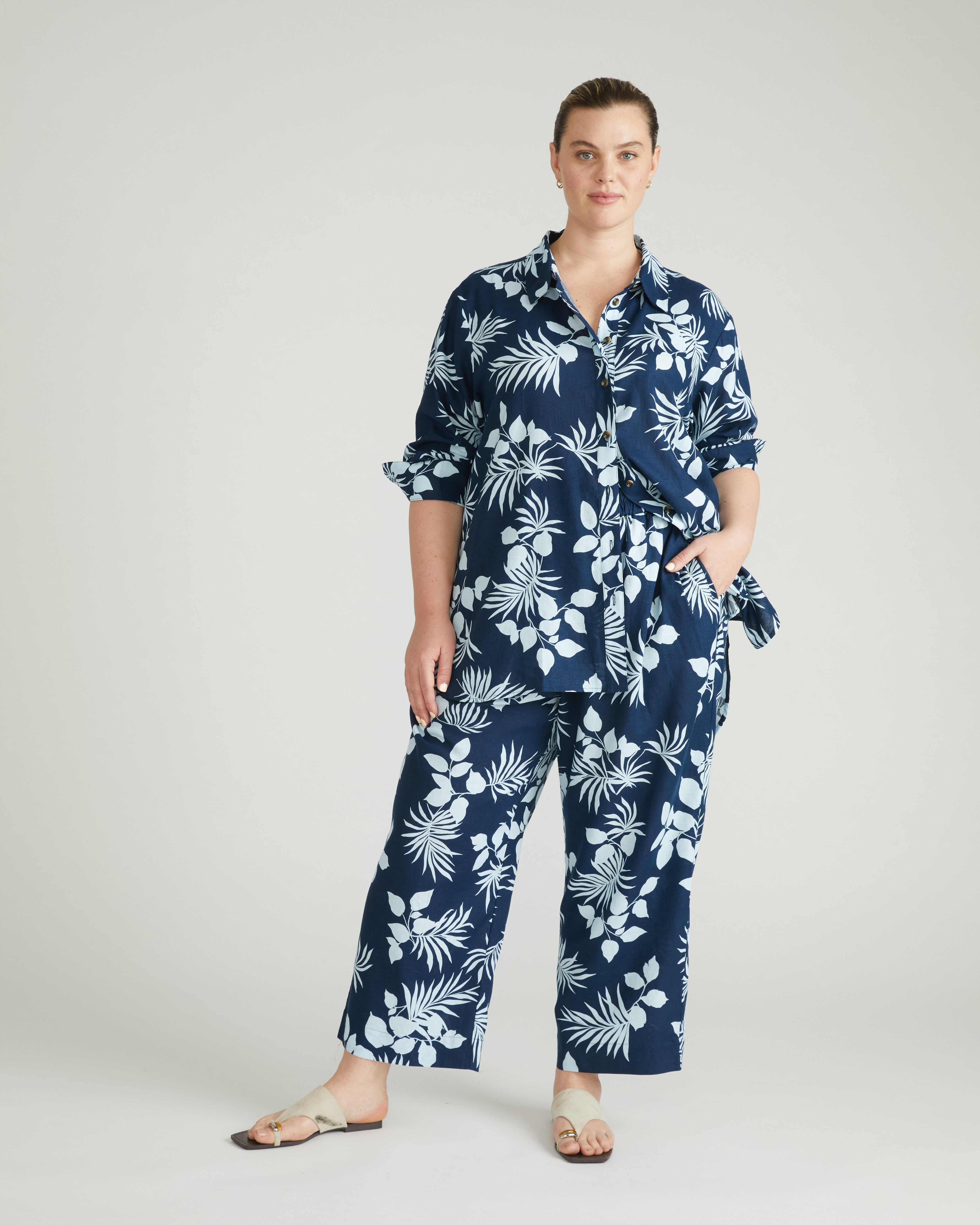 Dawn Linen Hi Low Tunic - Palm Print in Light Blue