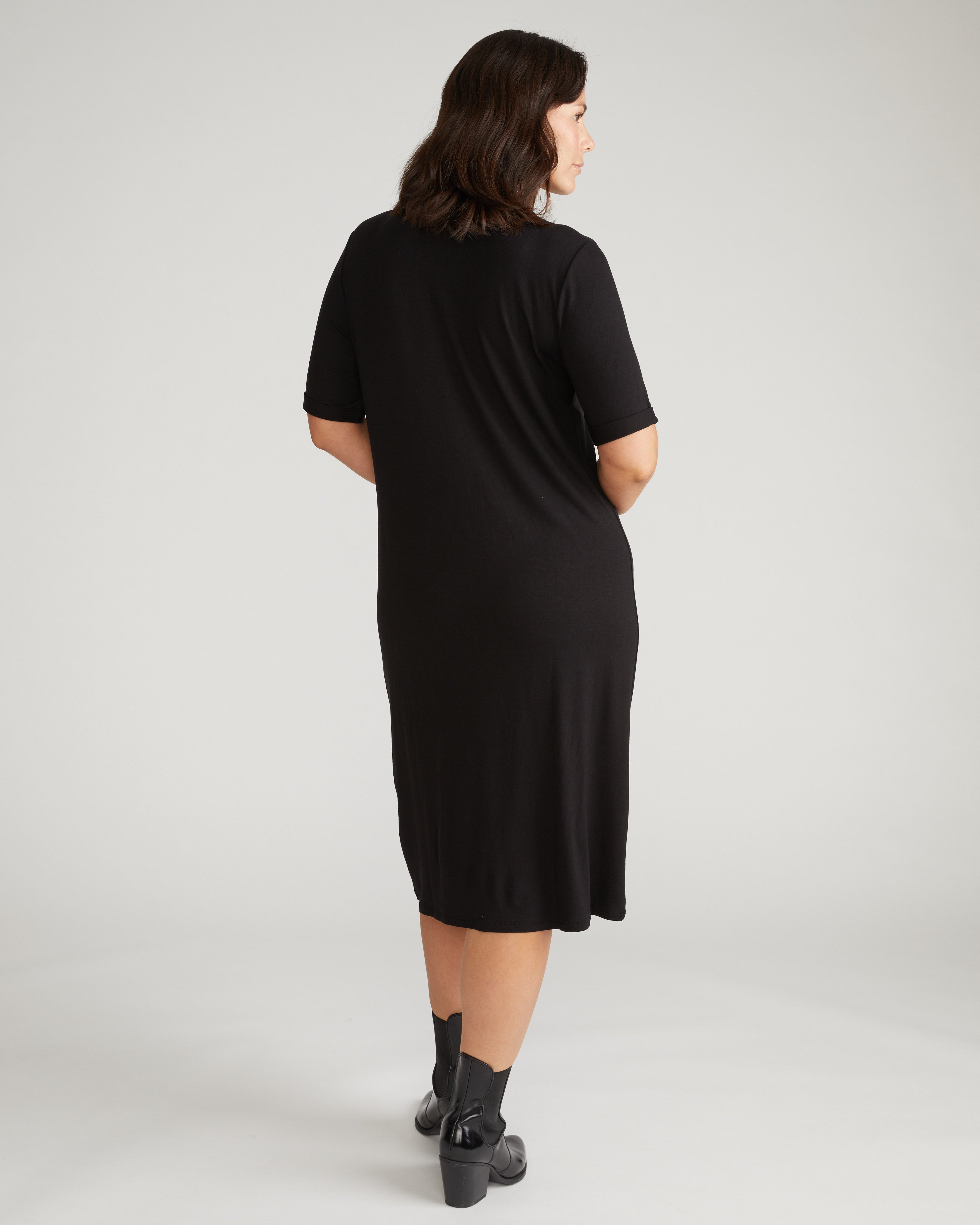 Our Lily Liquid Jersey Dress is based on our best-selling top by the same name. Streamlined details allow the expert fit to shine, with a soft crew neck and stovepipe sleeves. The dress is designed with hidden ease, lightly skimming your curves while taking full advantage of the stretch jersey for softness and comfort.