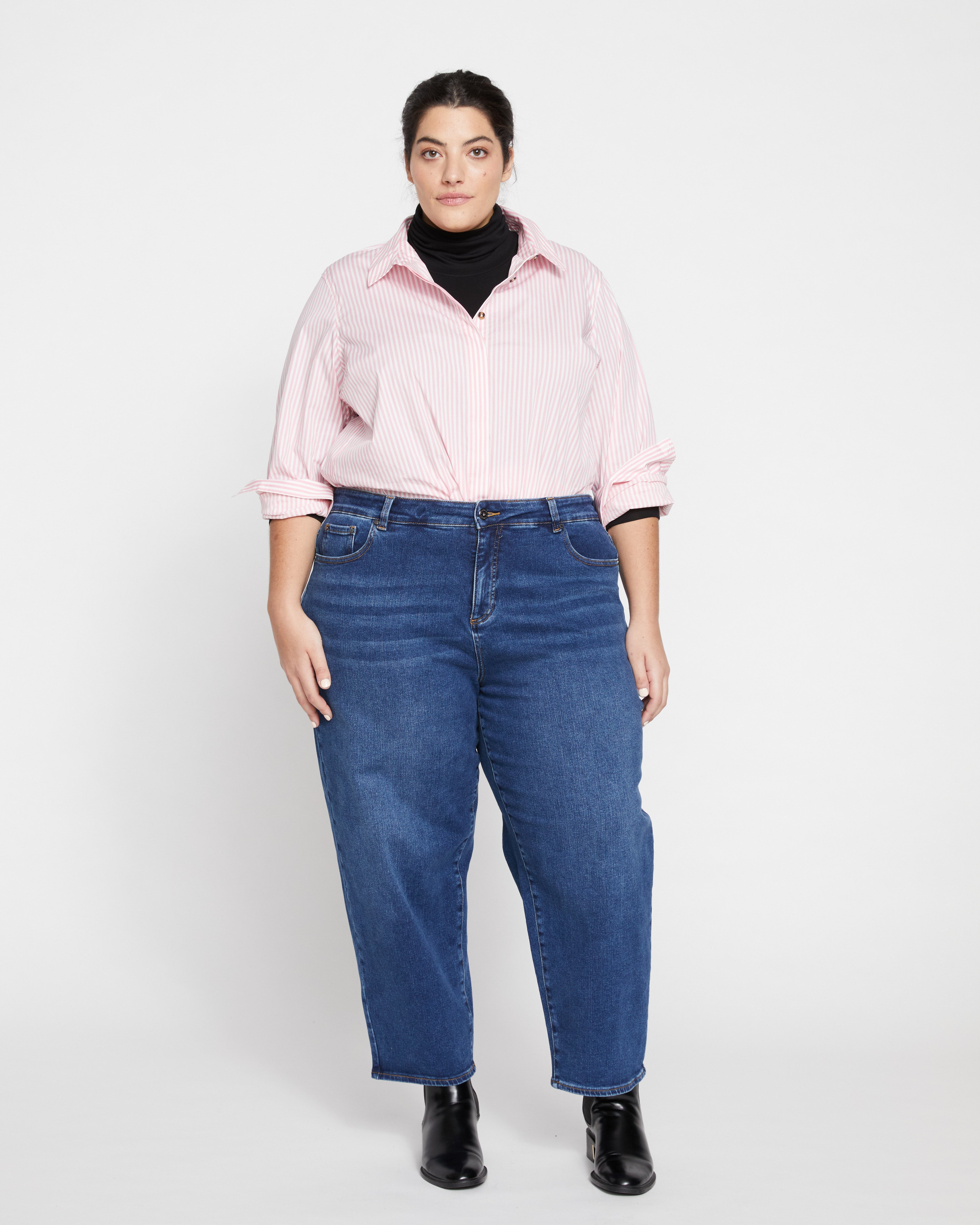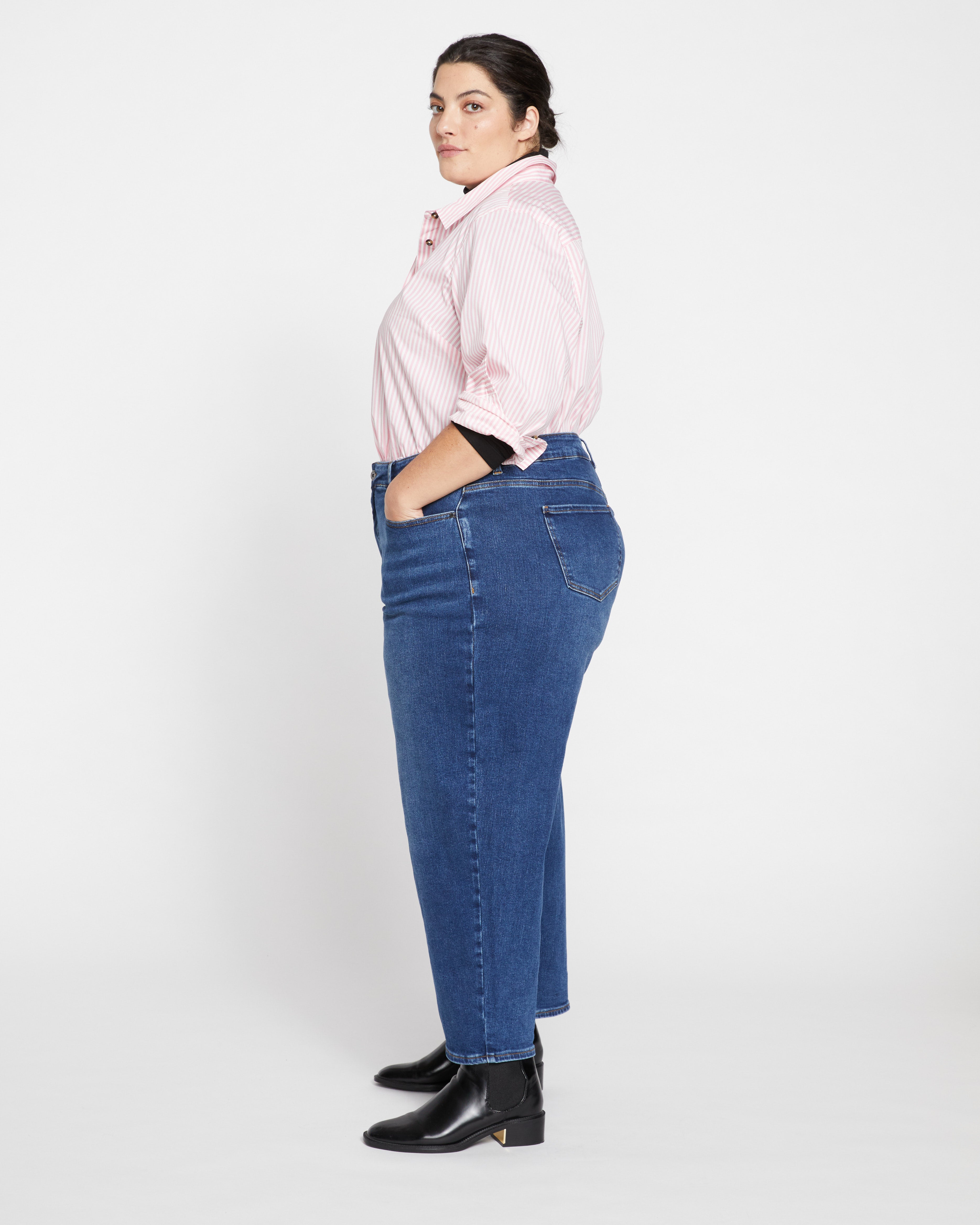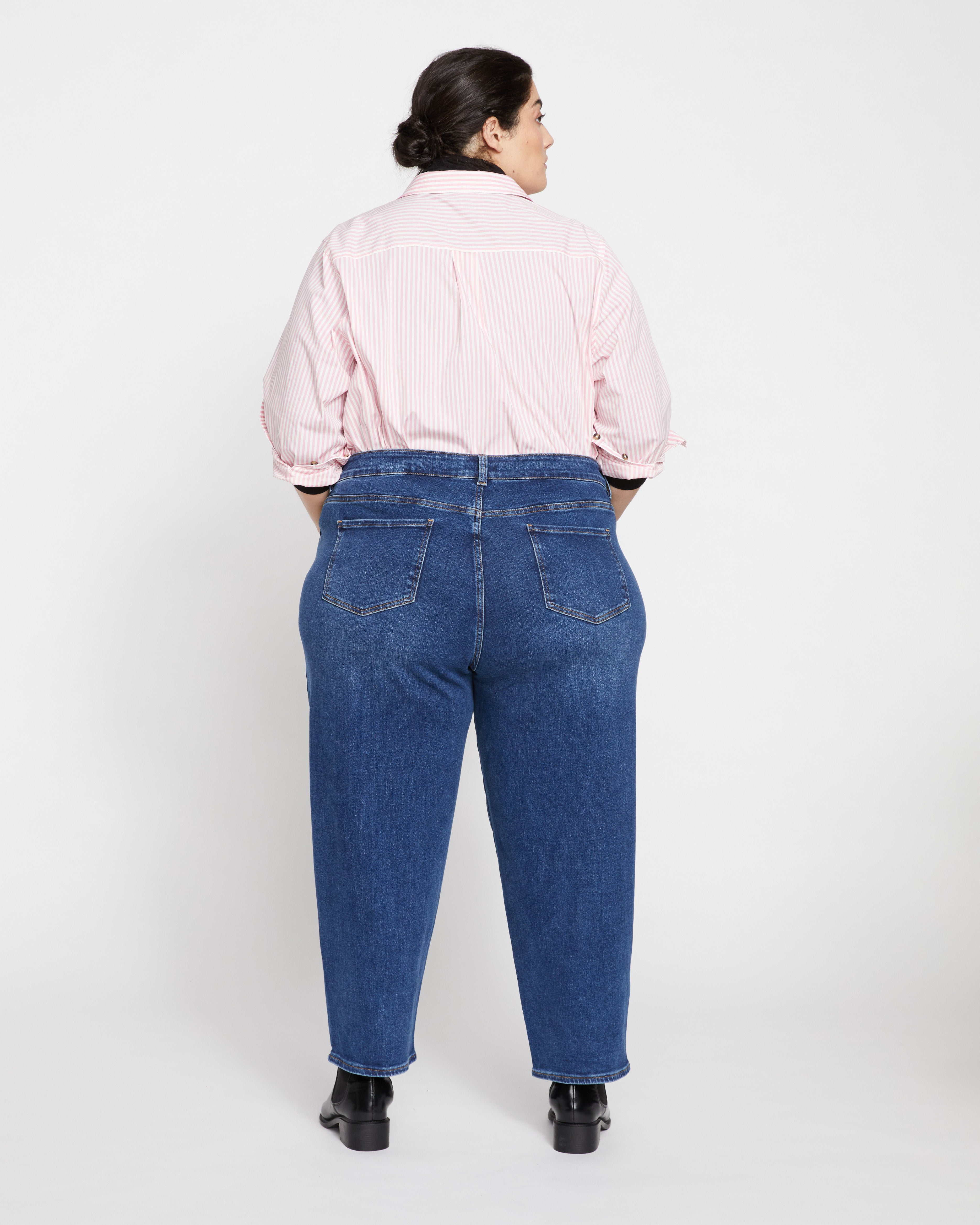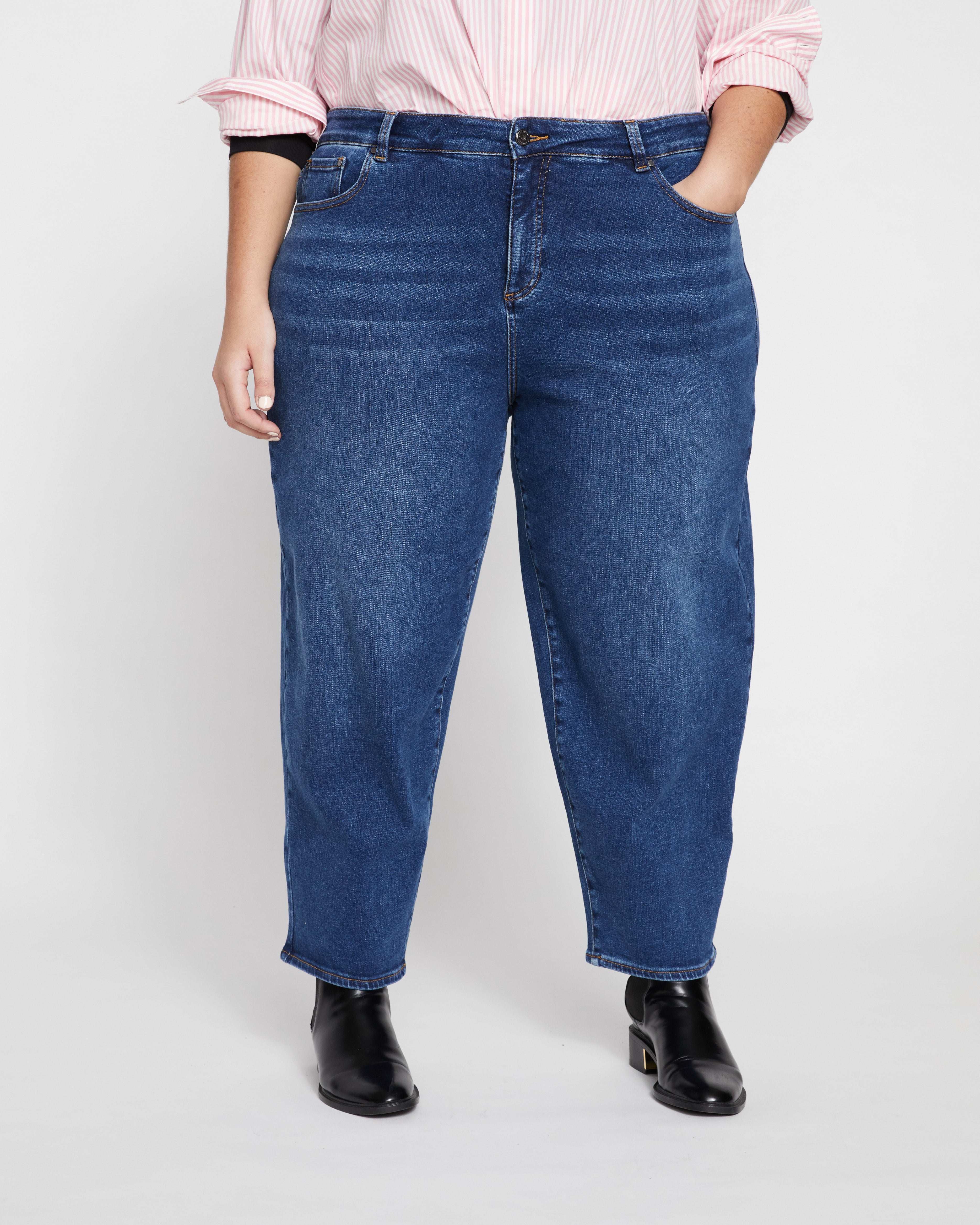 These are the jeans you need right now. High-waisted with a roomy barrel leg. It took five rounds of fittings to perfect this of-the-moment silhouette. With just enough volume that tapers at the ankle, they're made from a structured (but still stretchy) denim that holds its shape. We designed these to be styled two ways—play with sizing to find your favorite fit. Choose your true size if you’re into the oversize look, and size down if you want these jeans to feel fitted through the hips.
