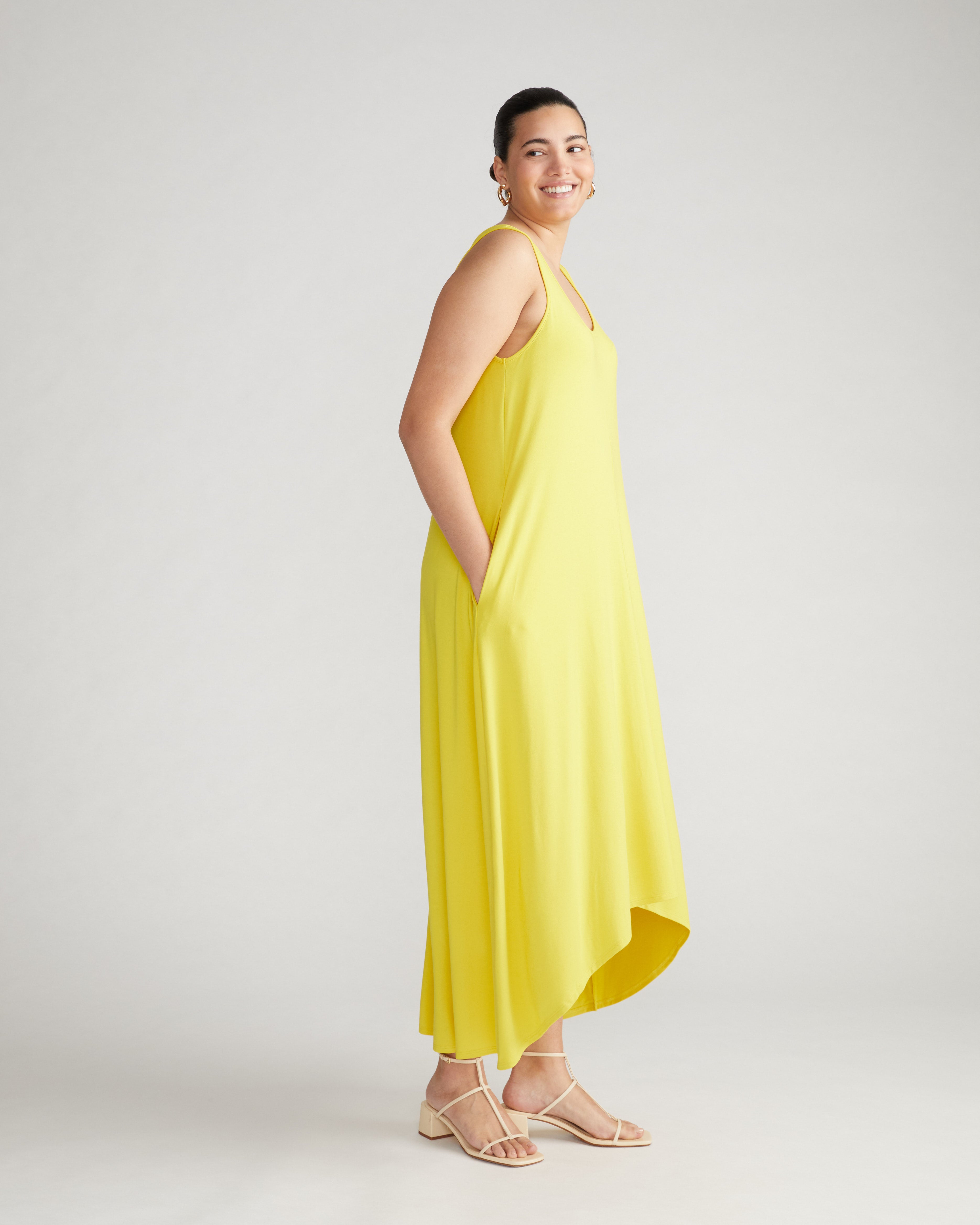 The Athena Hi Low Dress is a little luxe, a little casual, a little, well, everything. Made from a new Jersey fabric that is so luxuriously soft and carries a beautiful drape. Designed with a lovely A-line shape, this dress effortlessly flows down to the hi-low hem. Carefully stitched with side-seam pockets that stay in place. If you're looking for that dress that has an ethereal vibe, you've found it.