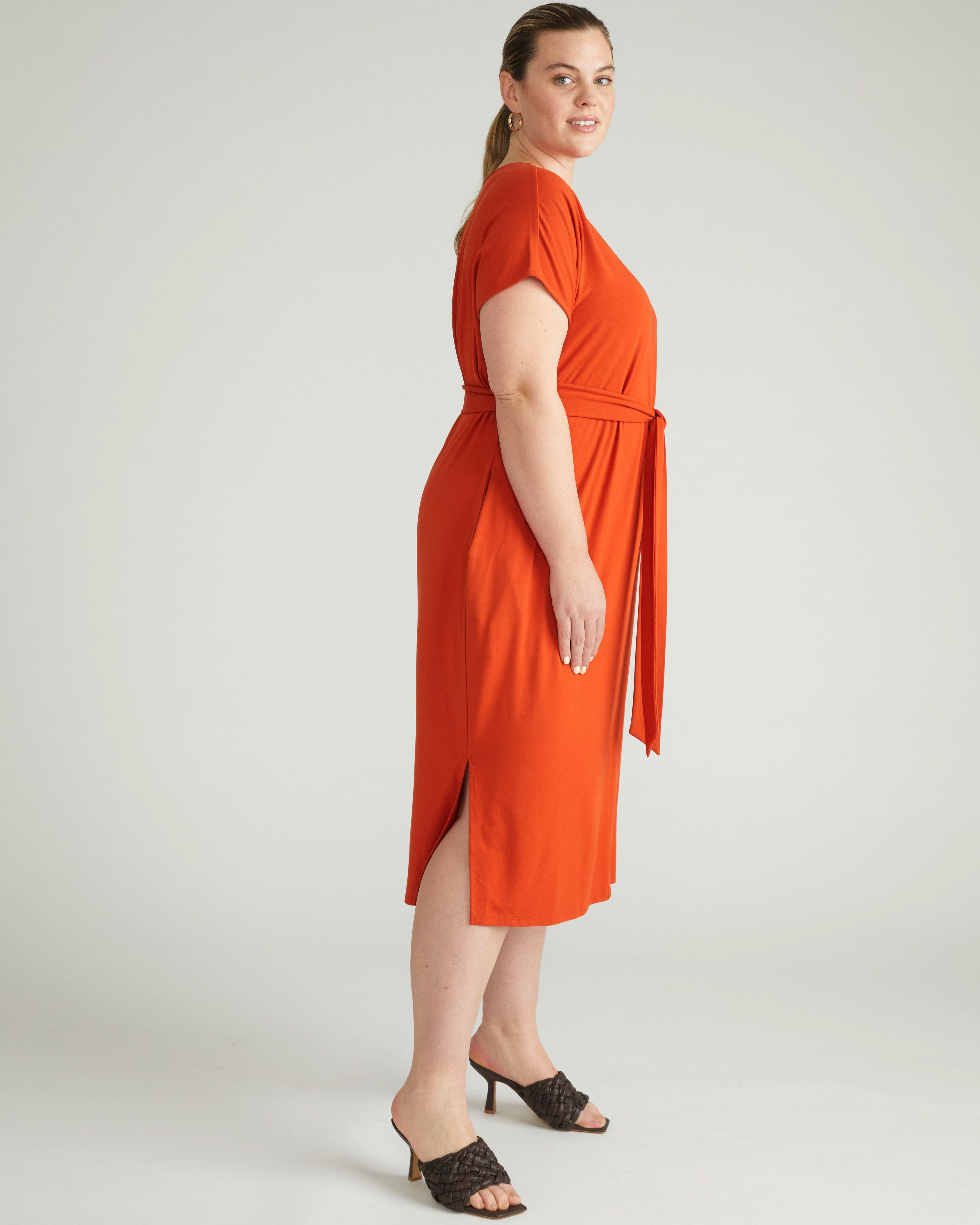Sophisticated meets casual. This classic dress is made from our softly structured divine jersey that has a luxe look and feel. Elegant and classic with the comfort of your favorite pajamas. Key details include the crew neck, short sleeves, a keyhole back, side slits at the hem, and a self belt