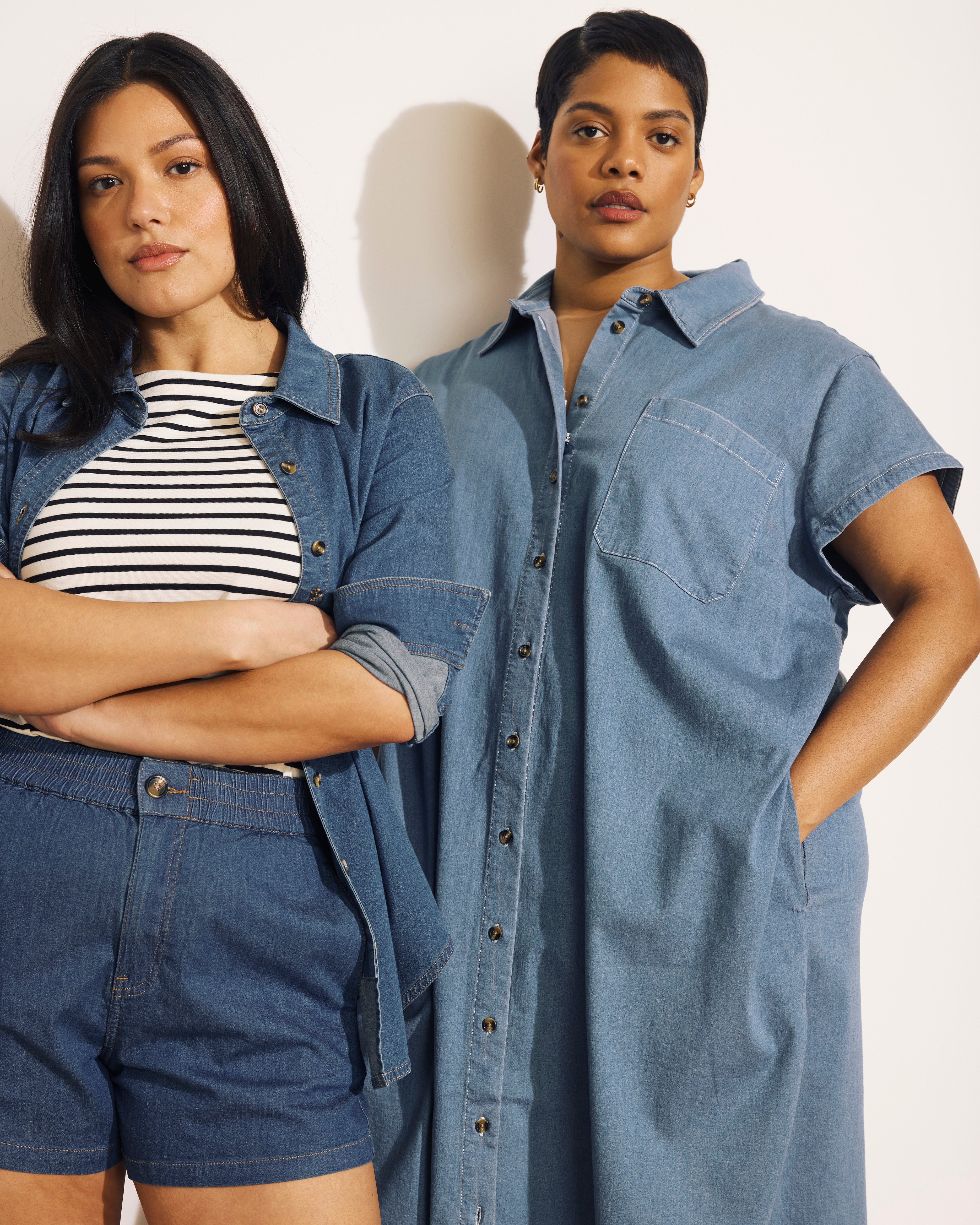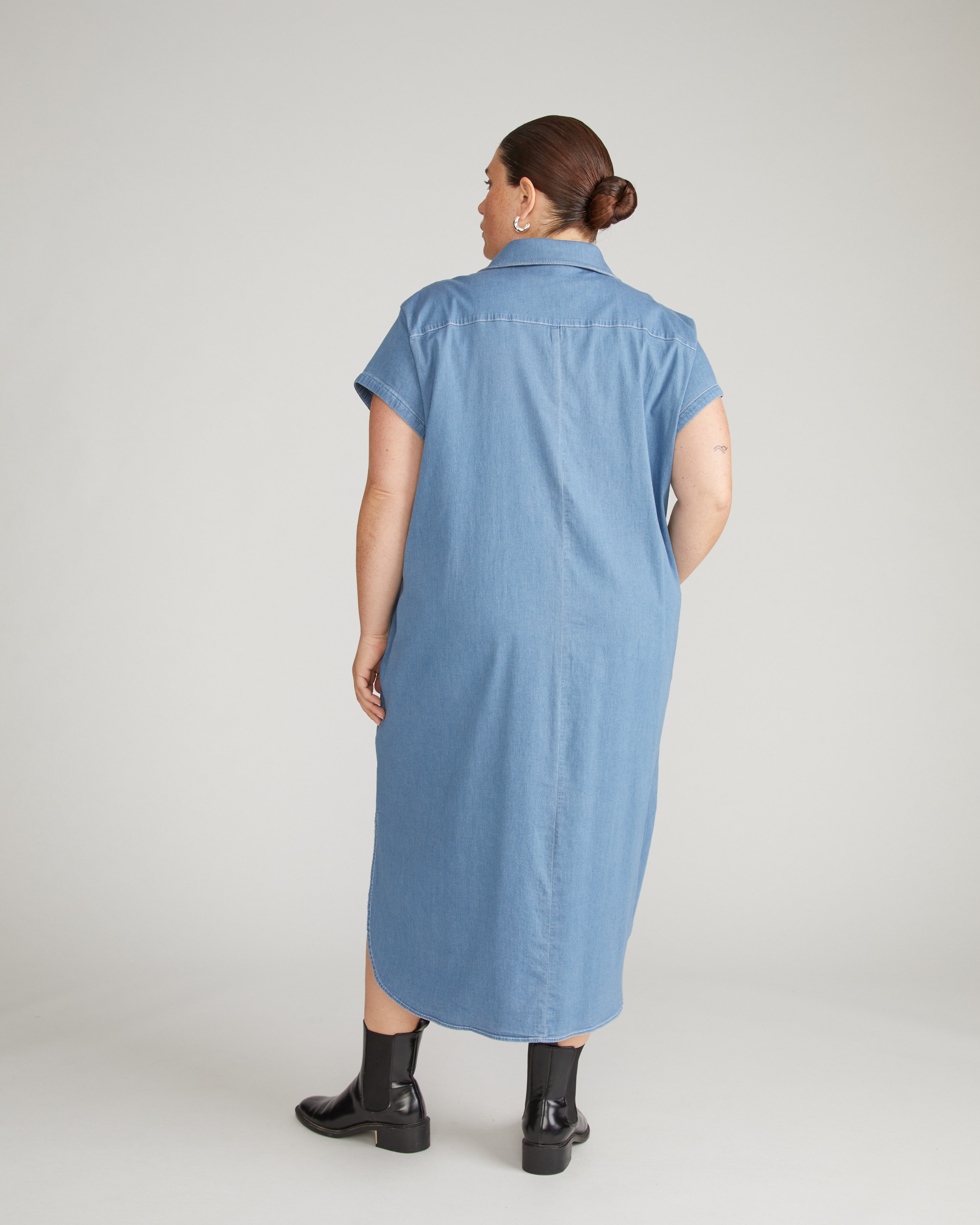Based on our best-selling Dune Linen Dress, we designed a new lightweight, comfortable spring staple in stretch cotton chambray. This easy-fitting dress features a generous cut in the sleeve width, side-seam pockets, and a high-low hem. And we haven't forgotten our signature hidden snaps at the bust��no gaps or pulling, just a flawless spring look.