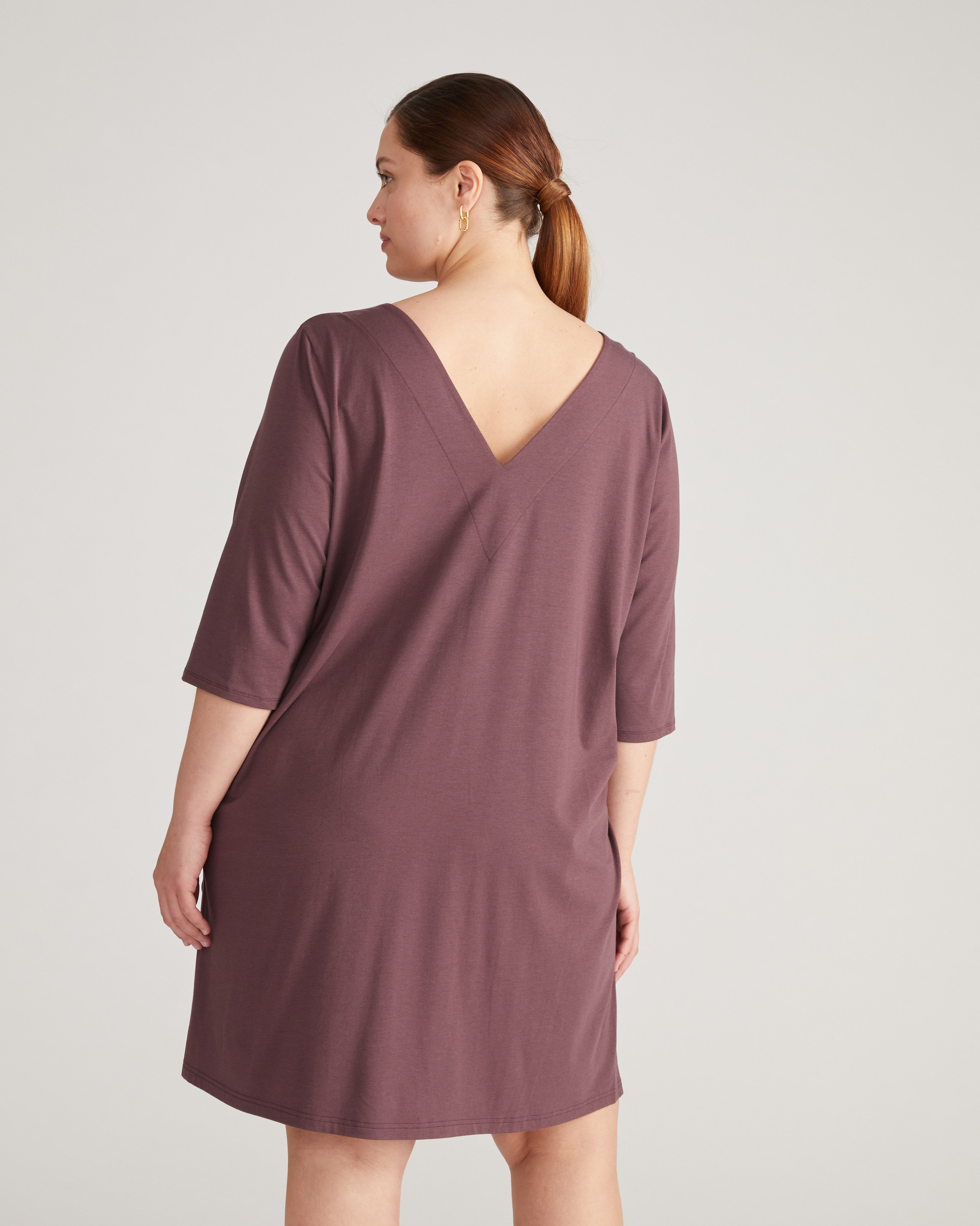 We made this fan-favorite sleep dress in our light-as-air UltimateS fabric. Meet the softer and more sustainable dress of your dreams. Key details include the double V neck that creates a lovely cascading drape, a hem that hits just below the knee, and the subtle side-slit detailing.