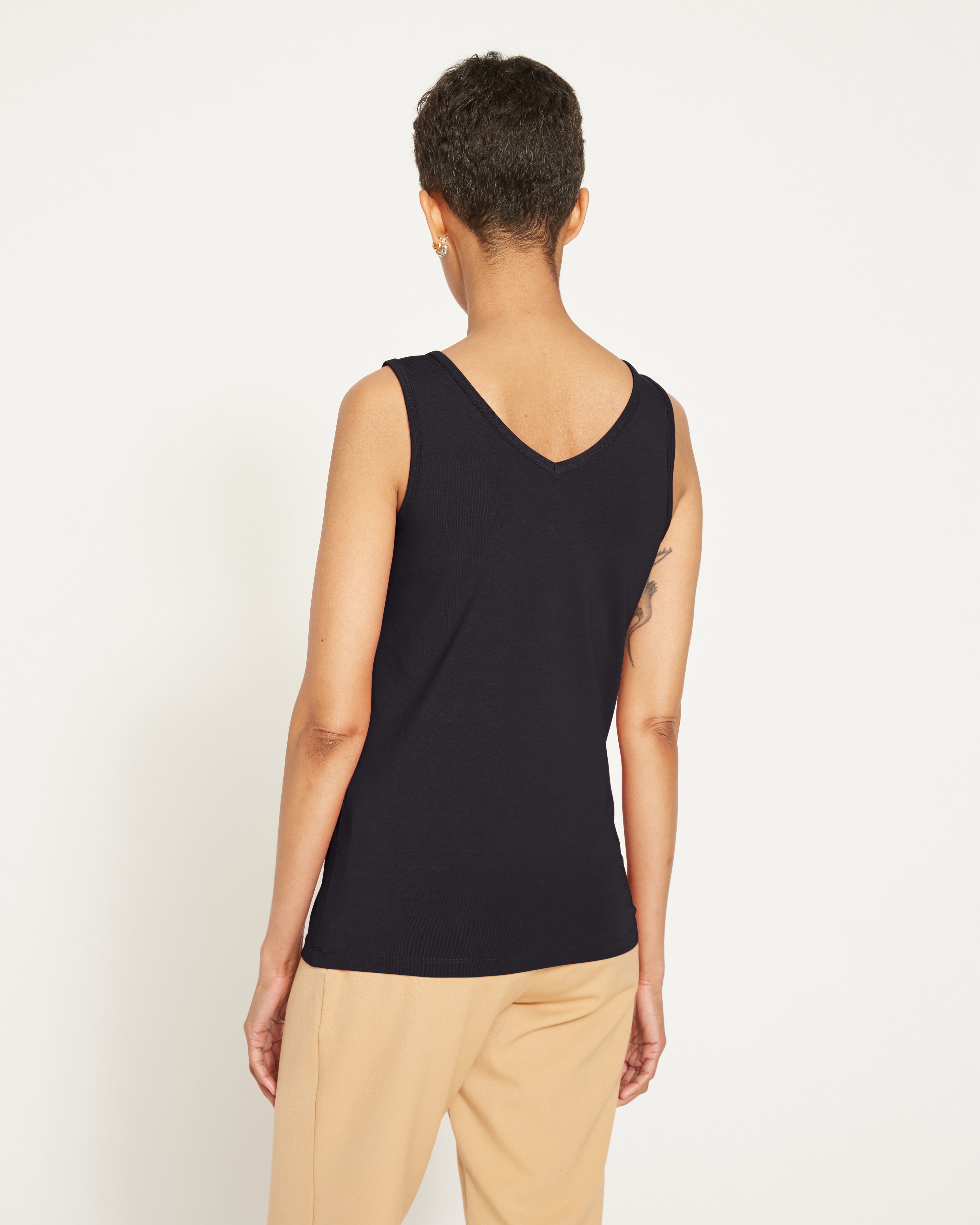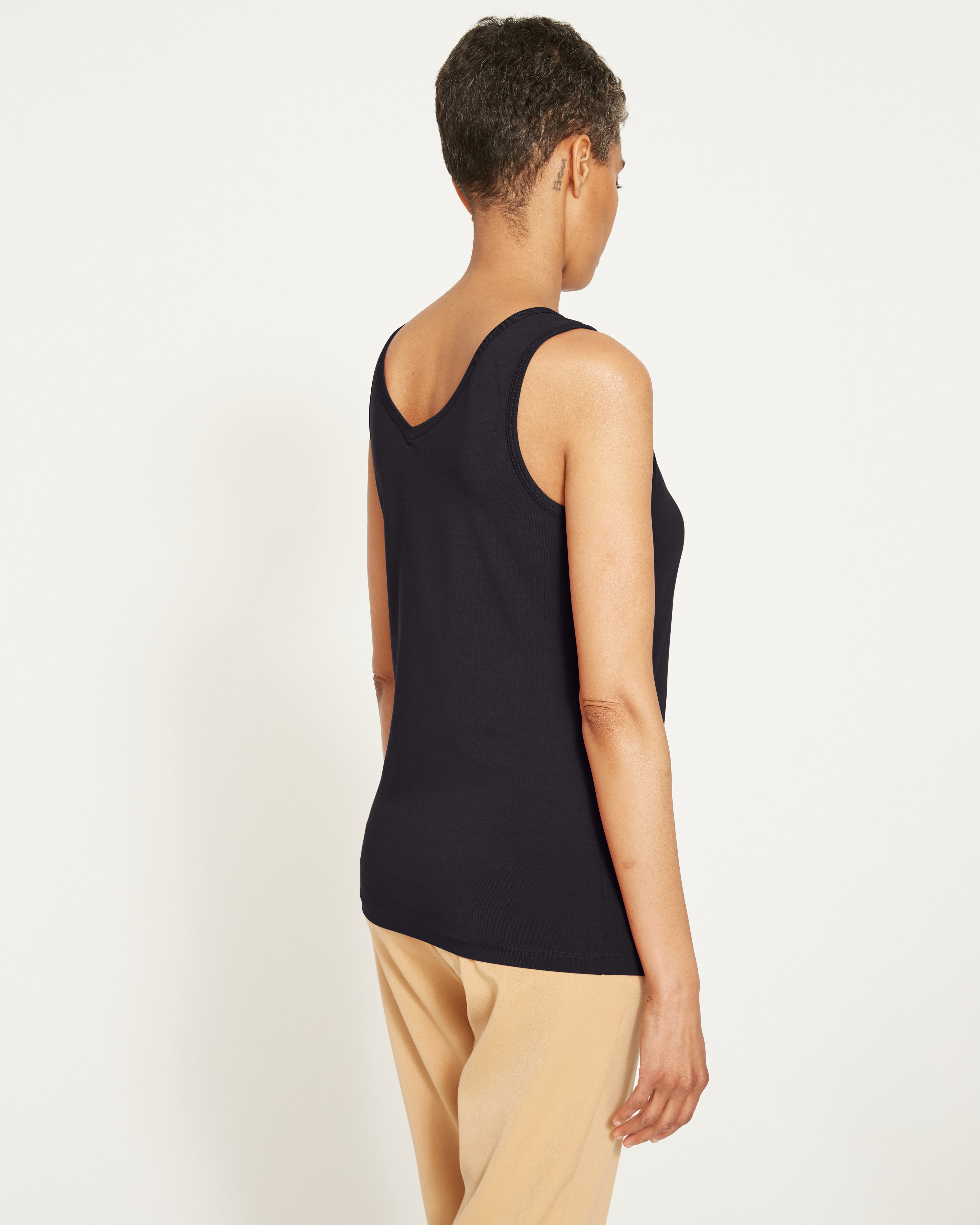 Your elevated everyday tank. An elegant double V neckline makes this easy piece feel extra special. Cut from a premium Peruvian cotton blend that we developed ourselves from the thread up, it has invisible stretch and the perfect length that’s not too long and not too short. The skimming silhouette looks great layered or simply paired with your favorite jeans. Oh, and you can tuck it in without fear—this fabric is pill-resistant.