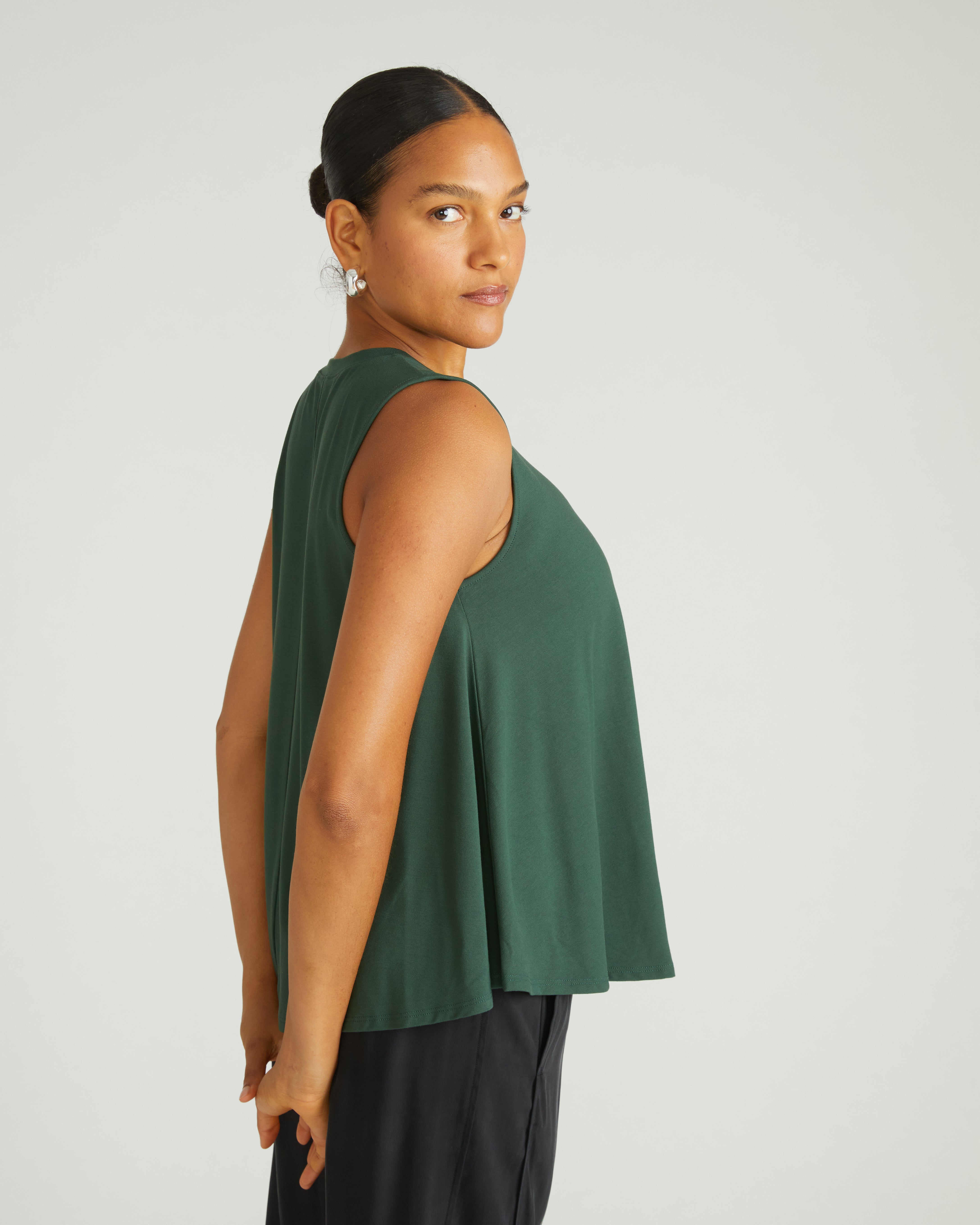 Beat the heat and look chic doing it. This beautifully drapey tank is made from our softly structured divine jersey that has a luxe look and feel. The chest fits close and then floats away from the body with a fared silhouette. And how elegant is the high neckline? We love this one.