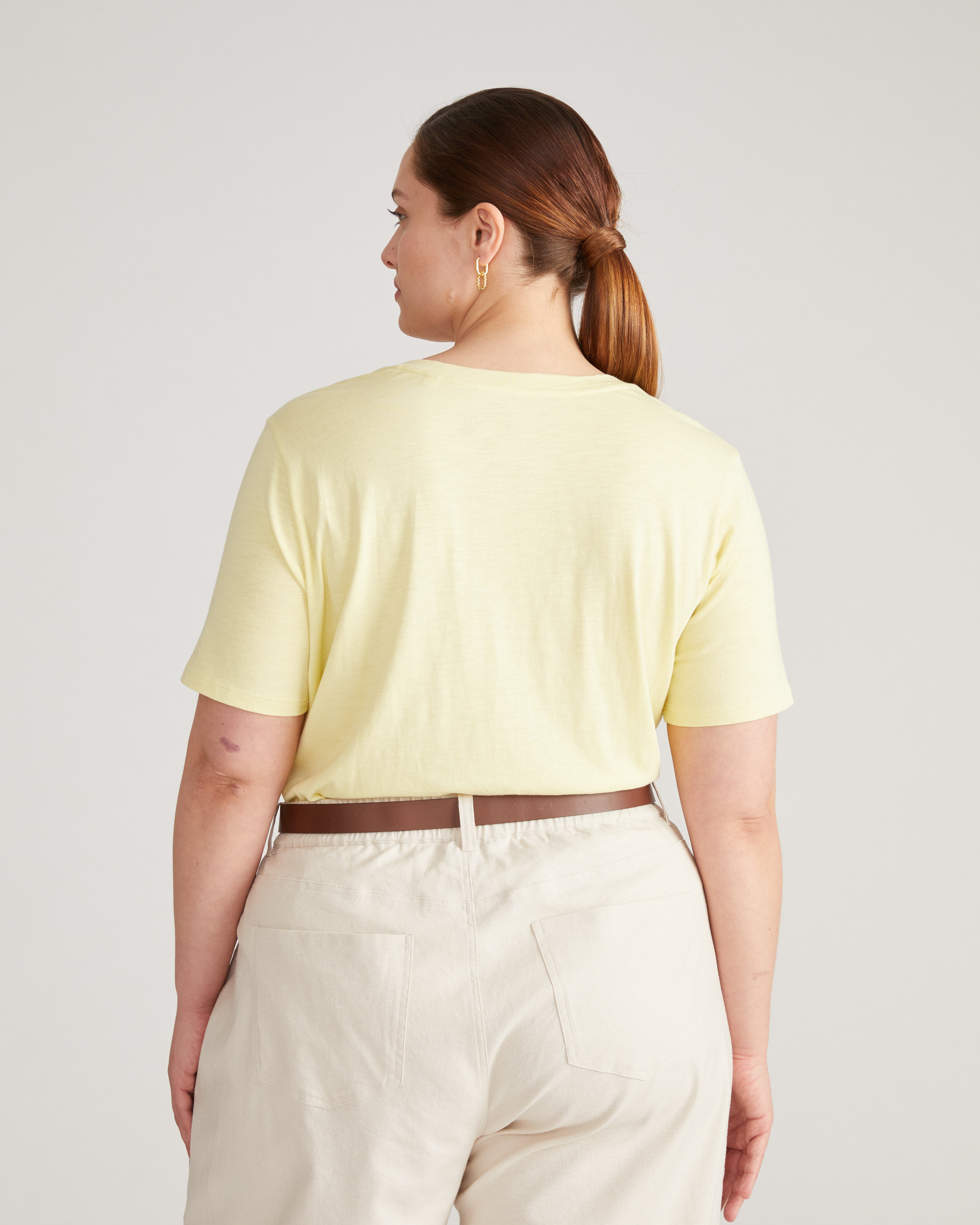 Our signature V Rex in a new light-as-air fabric. Tissue-like and totally nostalgic, light-as-air cotton is semi-sheer and fun to wear on its own or layer with other essentials. Soft and lightweight, it feels like a well-worn tee you’ve already loved for years and years. Carefully crafted for an impeccable fit, the V Rex features short sleeves, a strategically curved hem, and a length that's not too long and not too short.