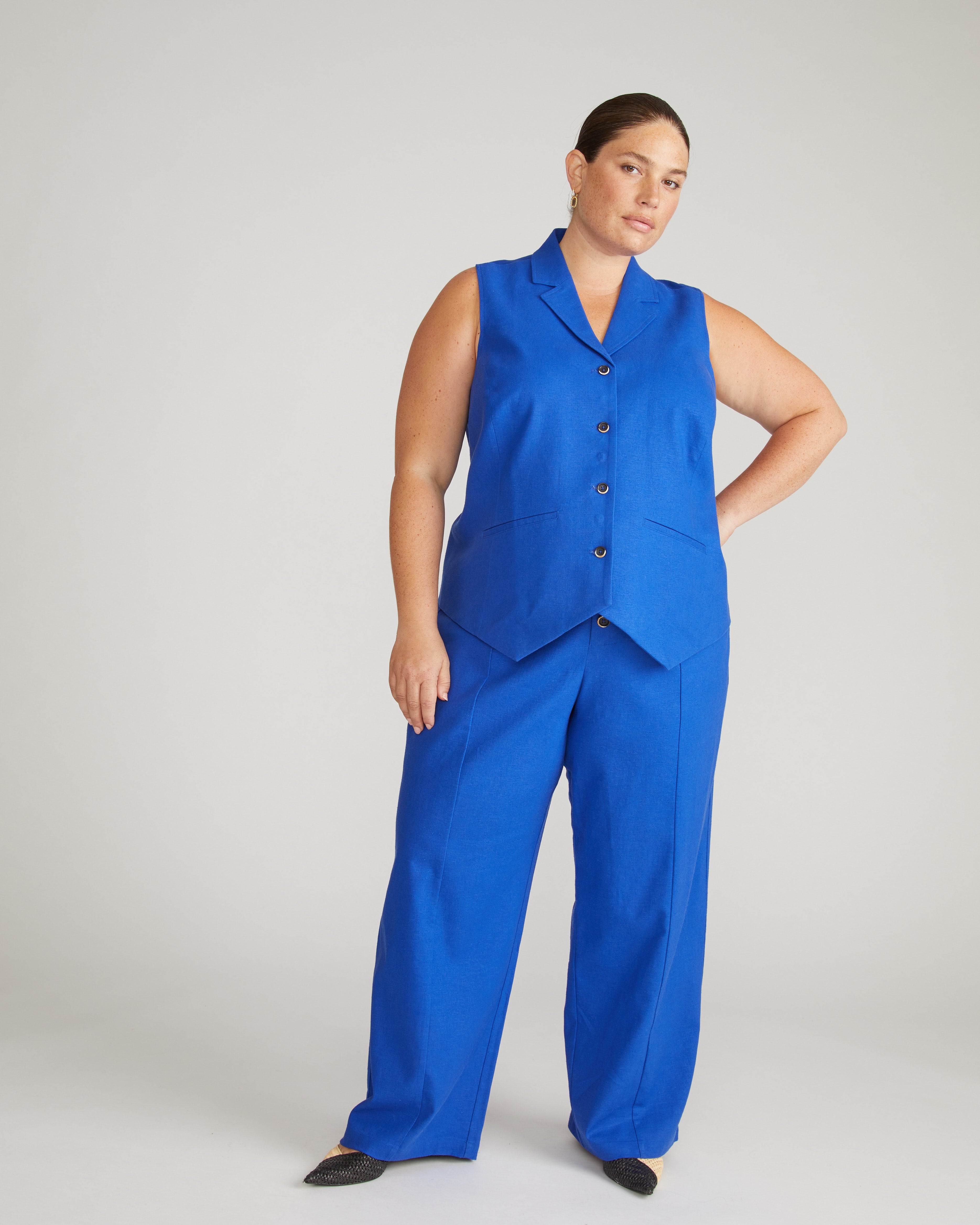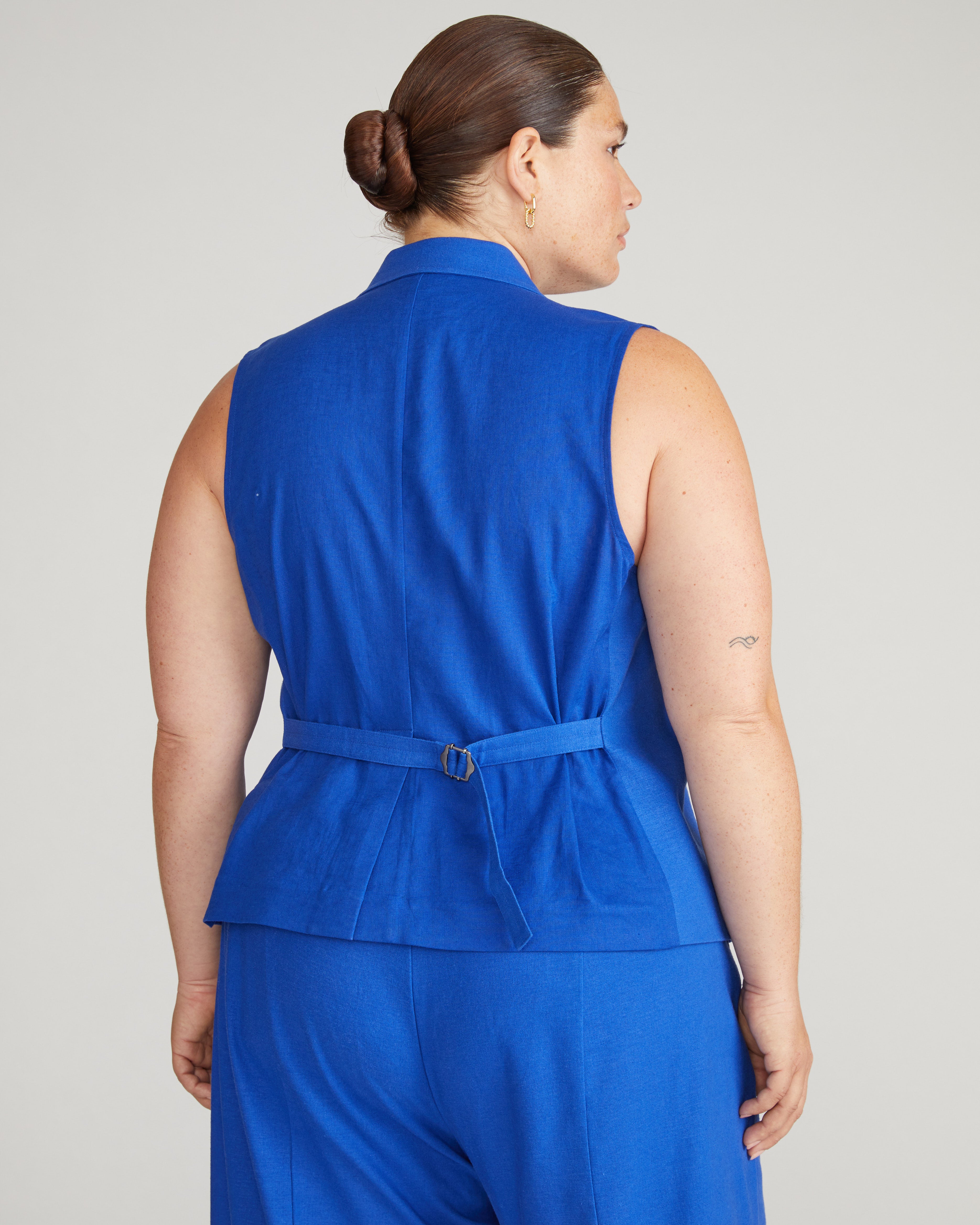The ultimate laid-back fabric wants you to know that it can also be serious. Linen means business in this chic and fashionable vest. It features a notch collar, buttons, and back belt. Wear it open over a tee, on its own as a top, and under the blazer for a very fancy three-piece-suit look. Oh�� and there are hidden snaps between the buttons to avoid a dreaded wardrobe malfunction.
